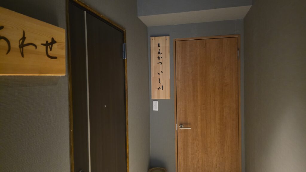 「いし川」の看板、ビルの奥に入り、2階へ上がる。複雑なビルだが案内を頼りに進む。ちなみにトイレだと思った場所は厨房でした。