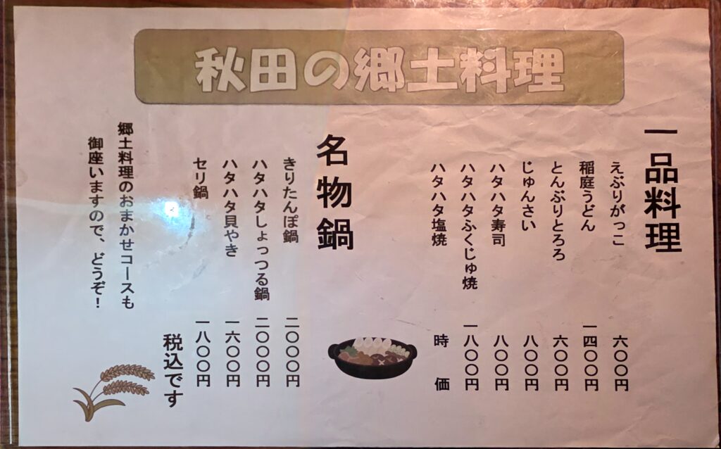 さて、いつも通り軽く飲もうと思ったけれど、こちらには鍋や秋田の名物が結構ある。