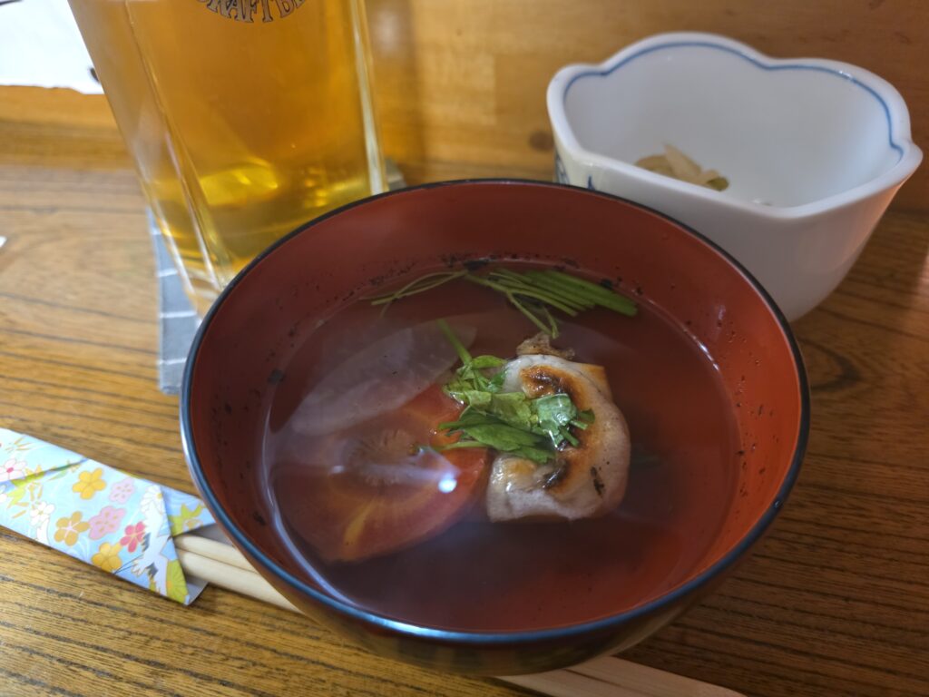 サービスでいただいたお雑煮、ビールでいただきます。マグロの塩辛をちょこっとつまむのがいいんです。全部1人前でお願いしました。