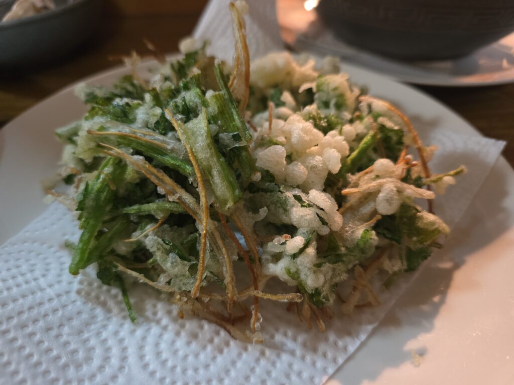 頭上のテレビを見ながら、セリの天婦羅も追加。男鹿の塩ふって食べる。