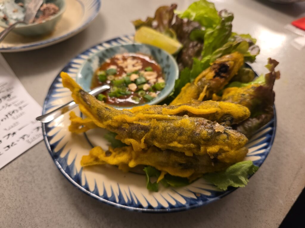 メヒカリって見つけたら頼んじゃうやつ。しかもターメリックの黄色い衣に、野菜を巻いてチリソースで食べる。
