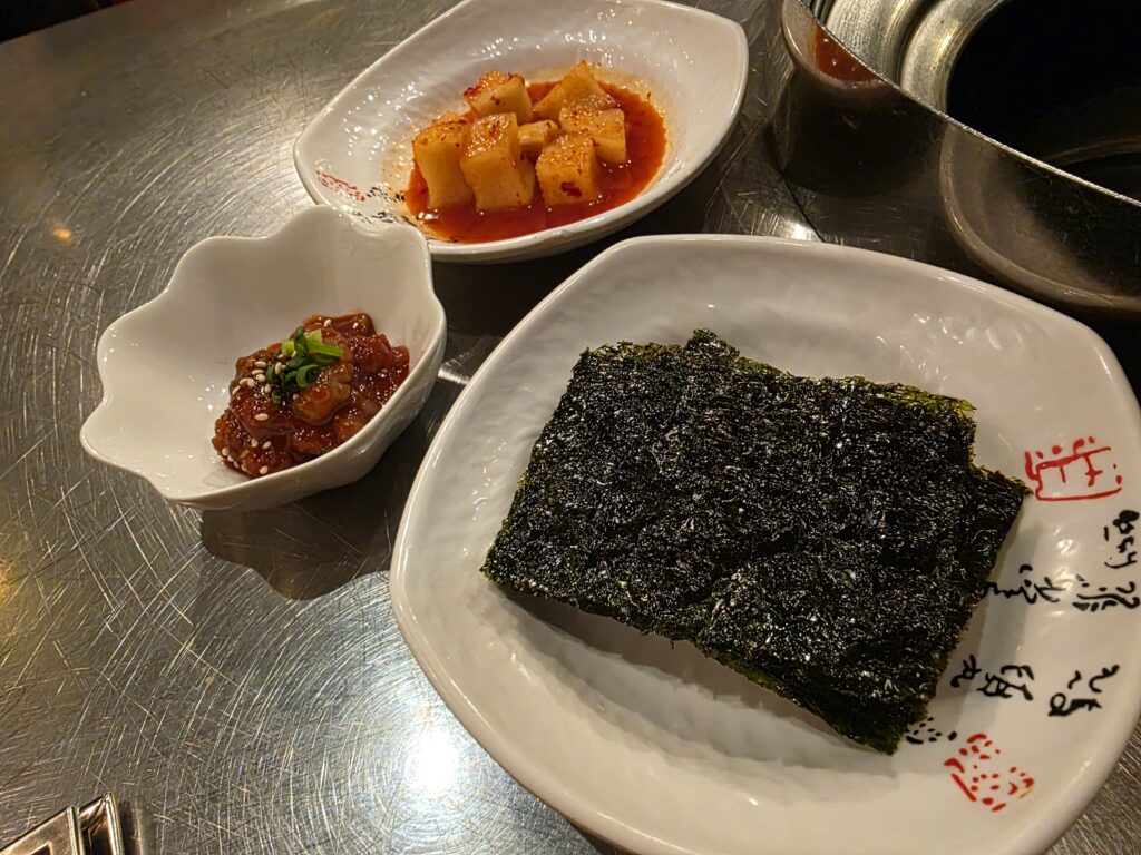 お通しの韓国のり、イカのキムチみたいなやつ、大根のキムチみたいなやつ、嬉しいですね。