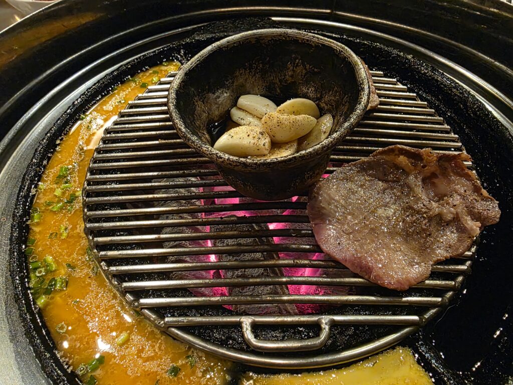 ネギ、辛味なんかと、ニンニクのオイル浸けがついてくるので網でグツグツしてからサンチュで巻いていただきます。
