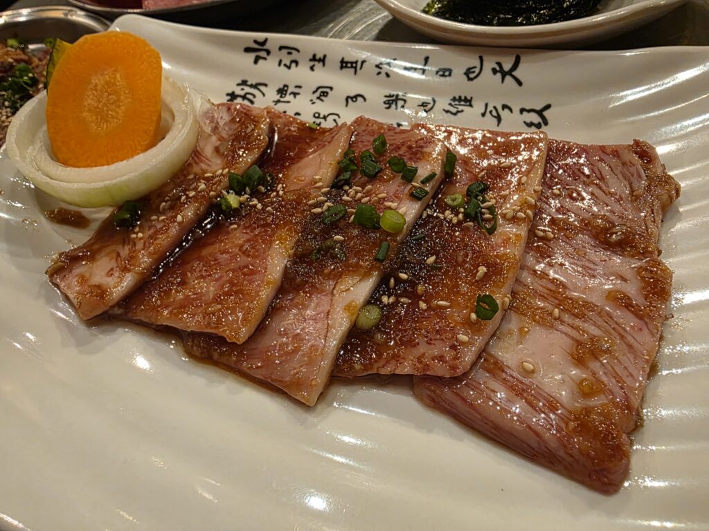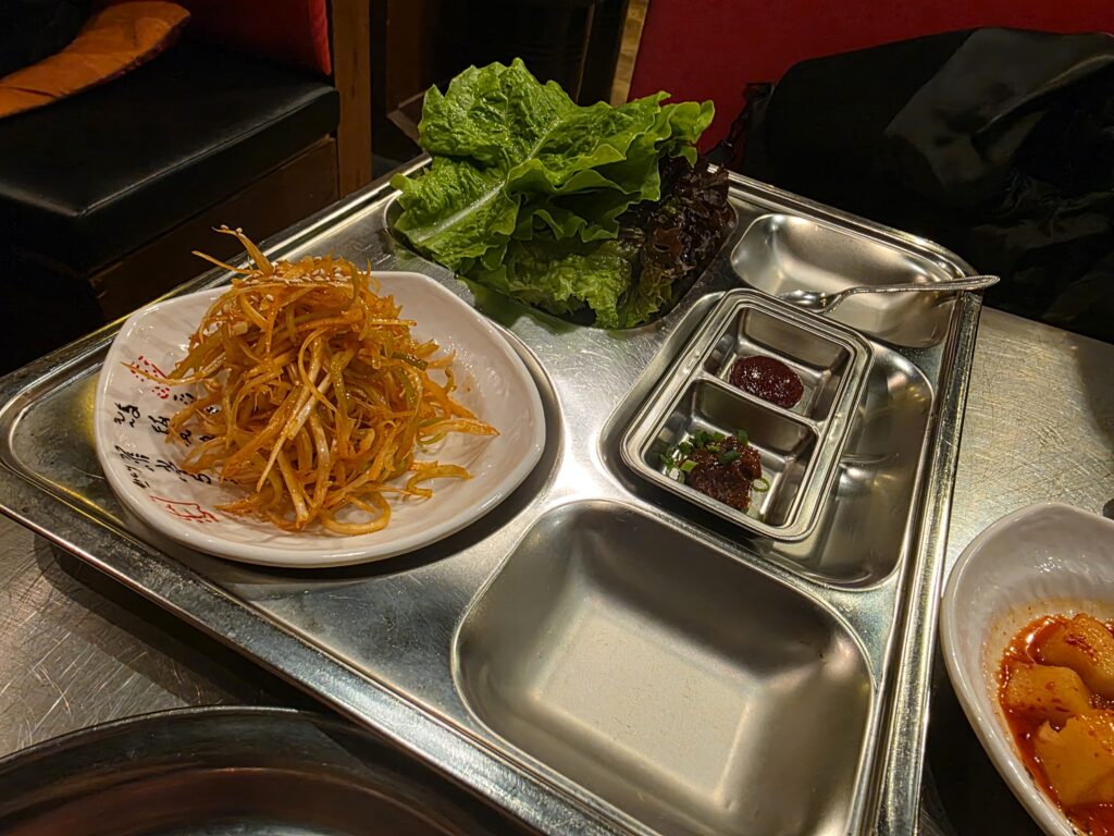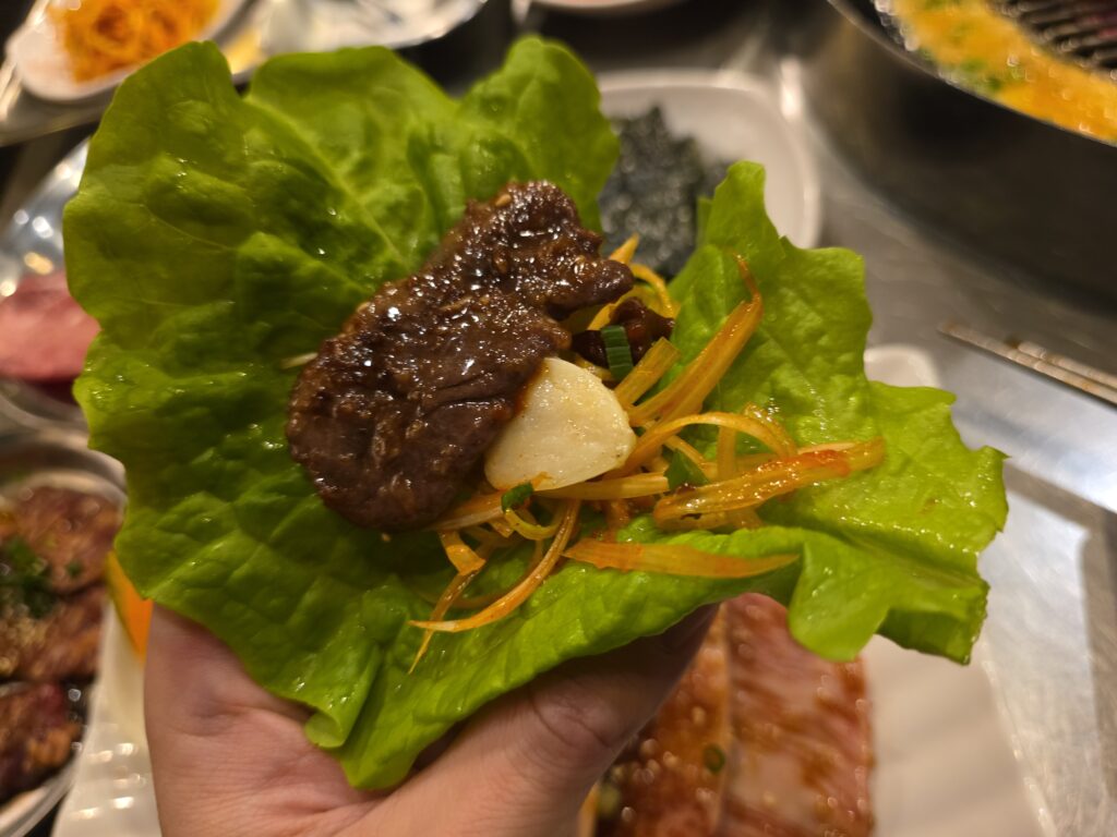 上カルビを巻くのは勿体ないのでハラミくらいを巻いて食べればセルフサムギョプサル、みたいな。