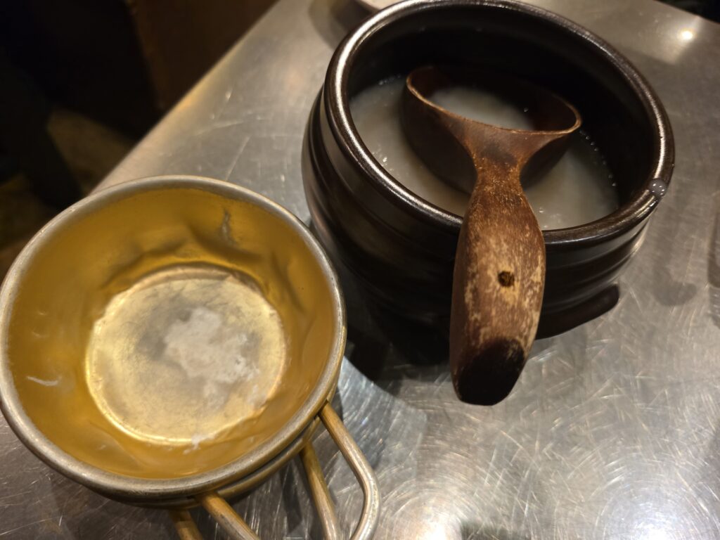 肉は前回よりはカチカチでもなかったな。タンは凍ってるくらいが案外旨い。こんなときはマッコリだ。