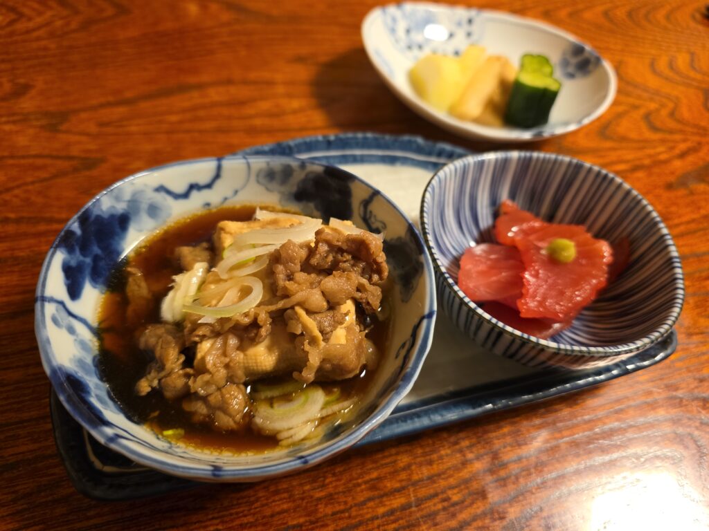 お通しにがっこ、刺身も来るなんて嬉しいなぁ。