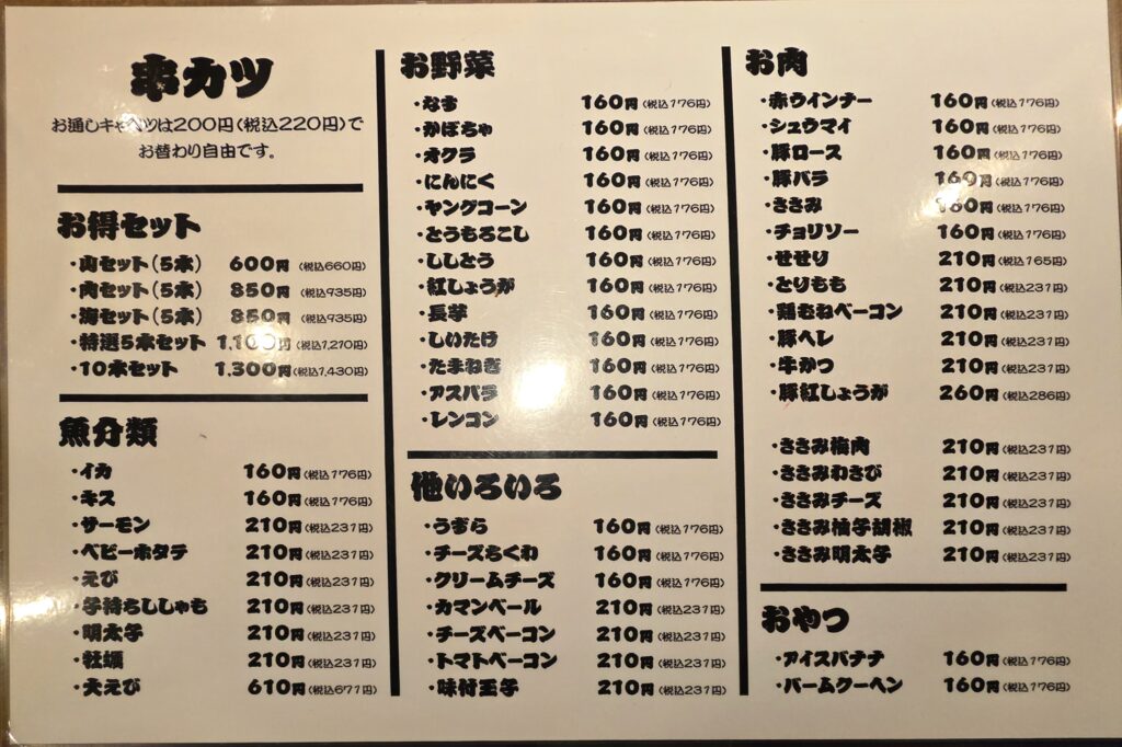 アスパラ、レンコン、カツオねぎま、カマンベールチーズ、ささみ、えび、うずら、豚へれなど。