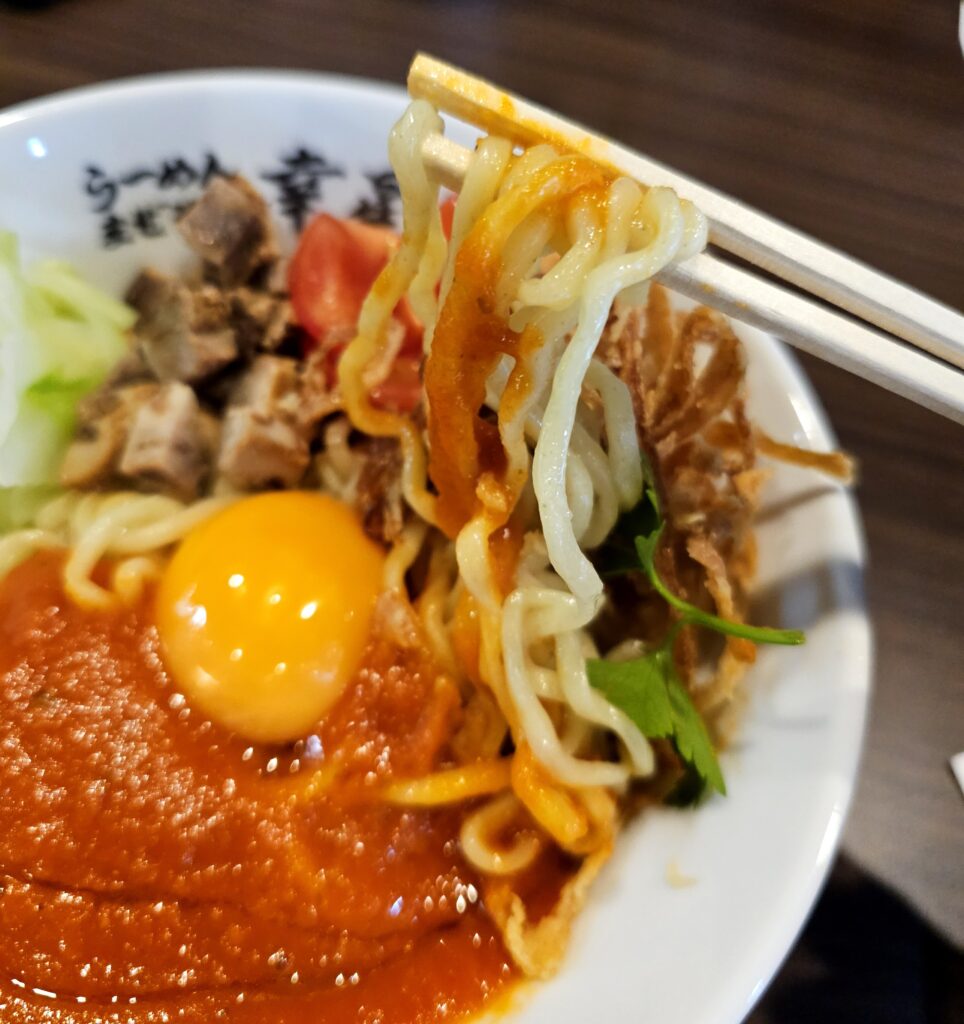 トマトラーメンは結構ストレートで細麺より。それよりは太いですが、まぜそばという印象よりは細めかな。
