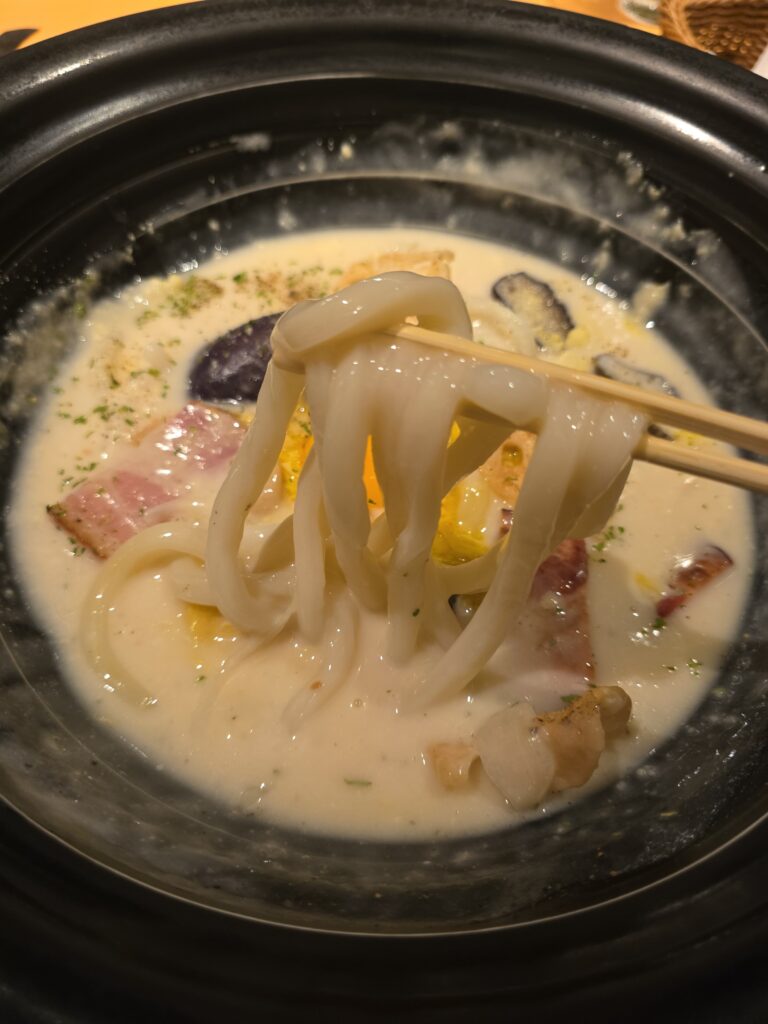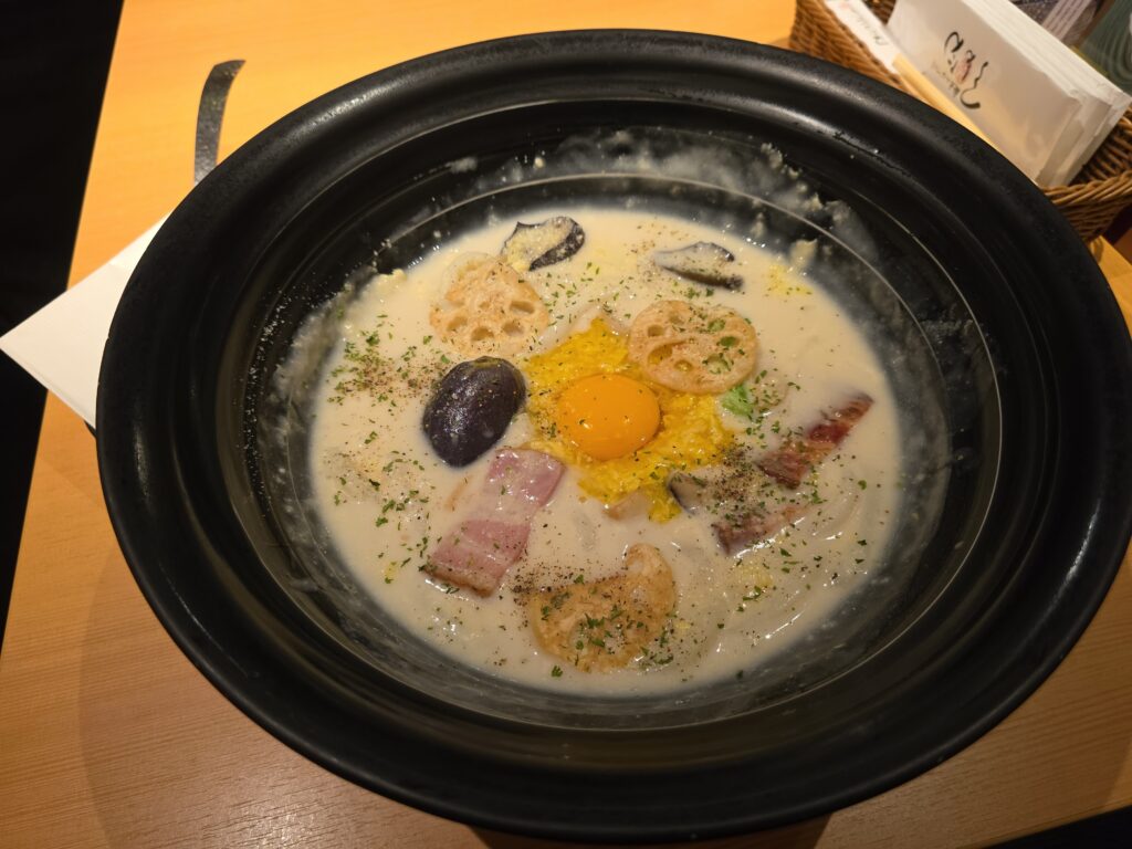 でっかい器。まさにカルボナーラ。ちょっと高めの値段ではありますが、これだけの贅沢。ナスや蓮根などの具材がとても旨いのだ。