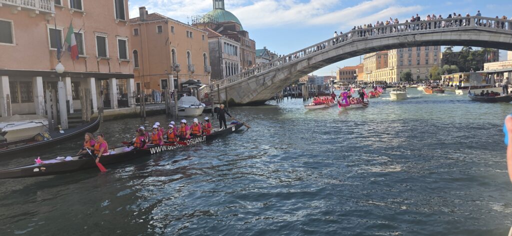スカルツィ橋も人が多いし、なんだかピンクリボンの部隊がせっせとボートを漕いでいた。
