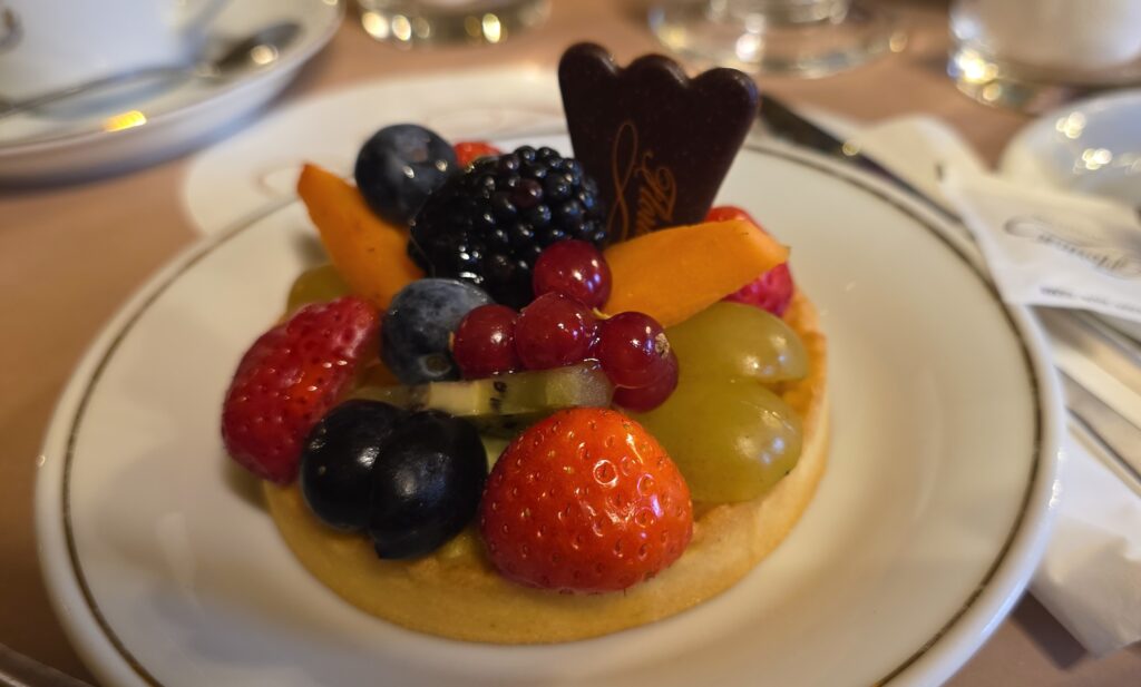 ドリンク2杯と新鮮なフルーツタルトで1人€25程度と高め、チャージもかかっているのか。