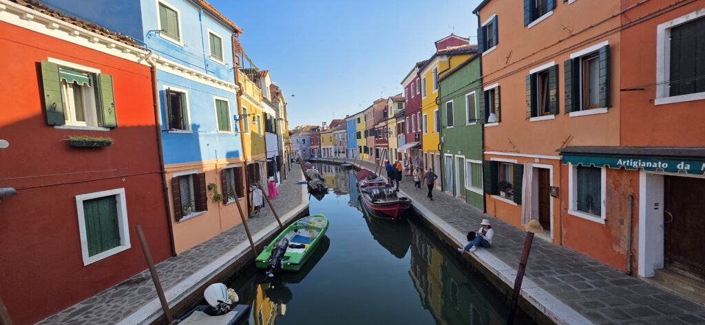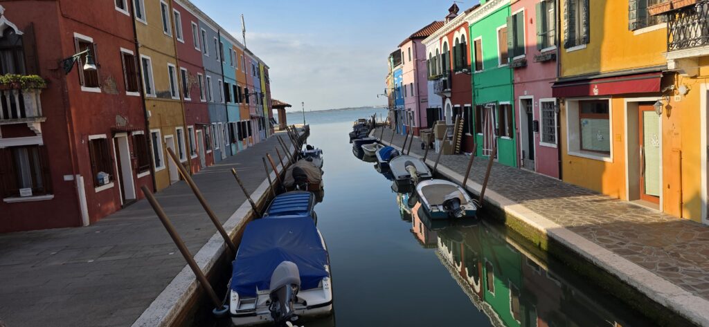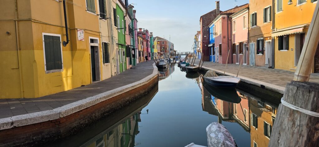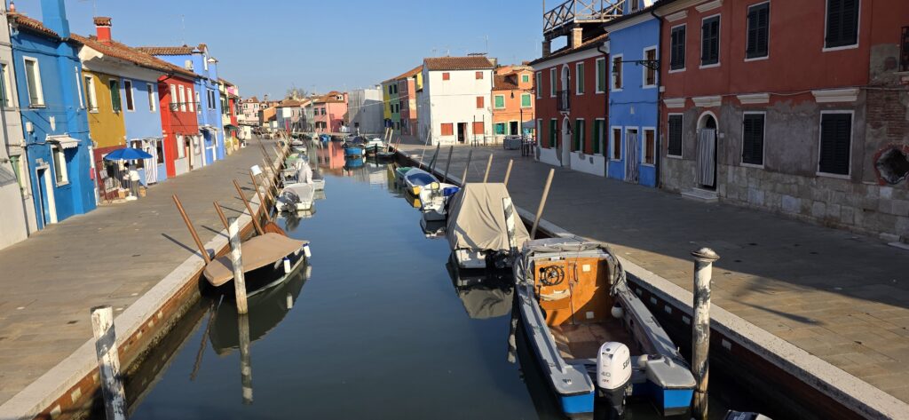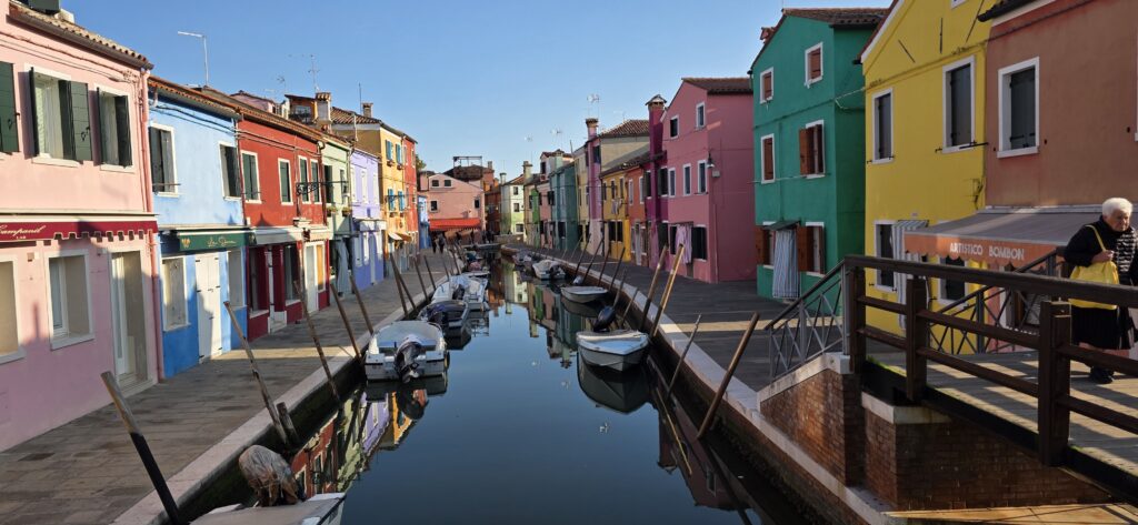 本島からヴァポレットで約1時間、カラフルな建物が並ぶ島は霧の多い海上から自分の家を見分けるためだという。