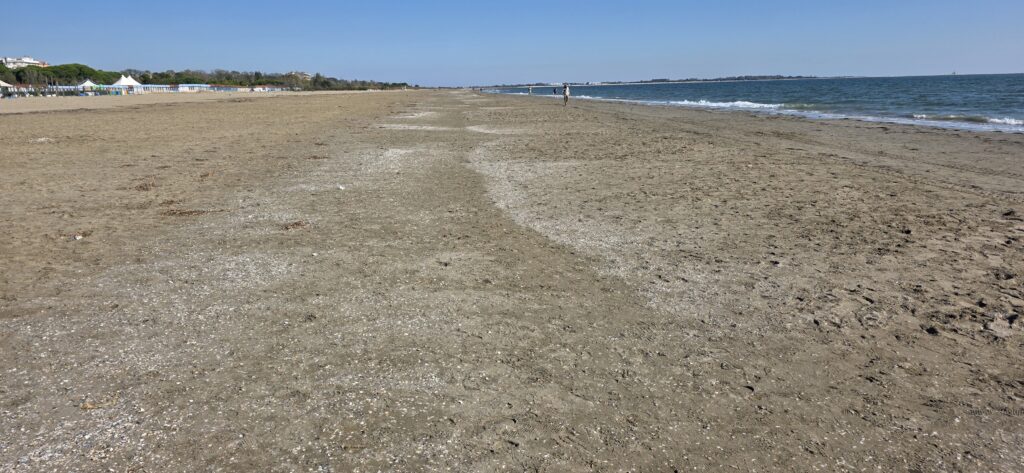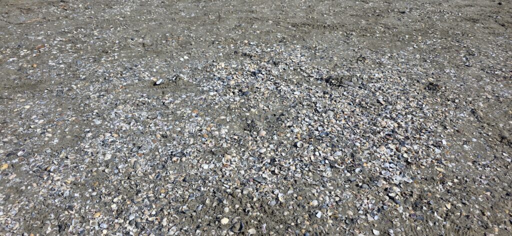 靴に砂が入らないように気を付けて歩くが貝殻の場所は歩きやすい。