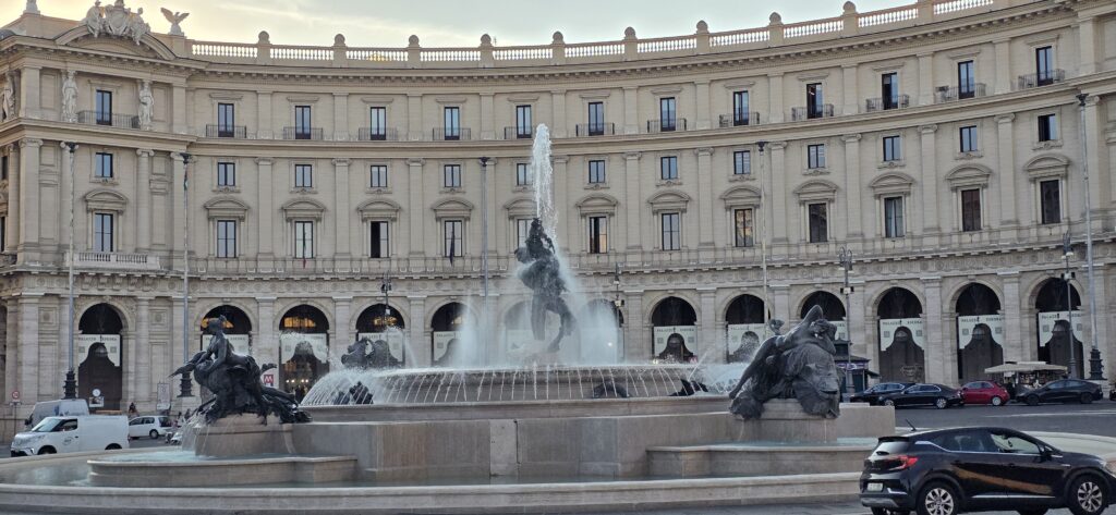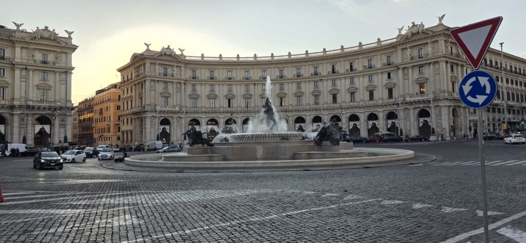 イタリアはこんな交差点も多いが、一際目立つ噴水の周囲に豪華な建物が並ぶ。