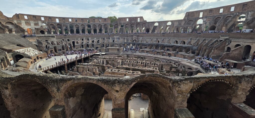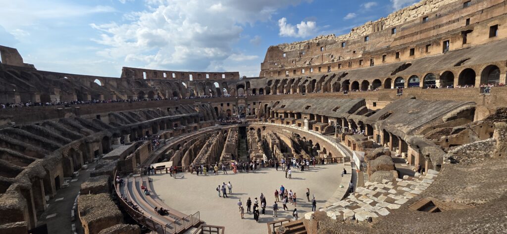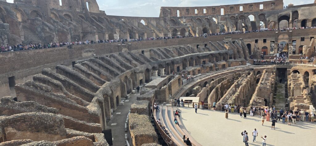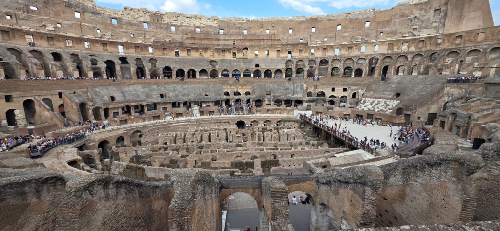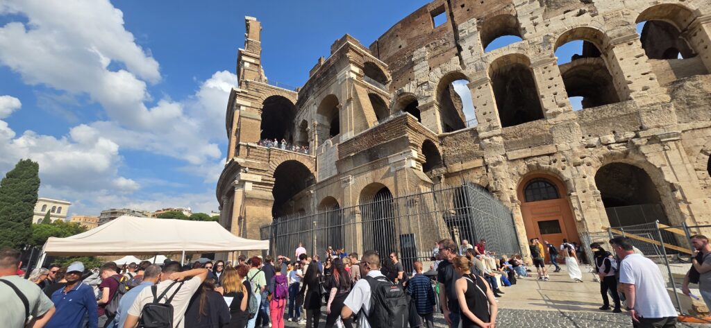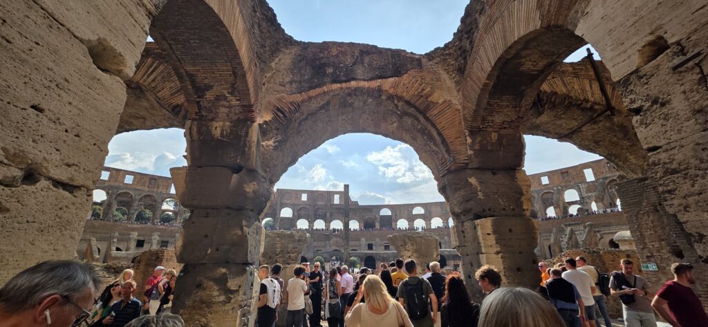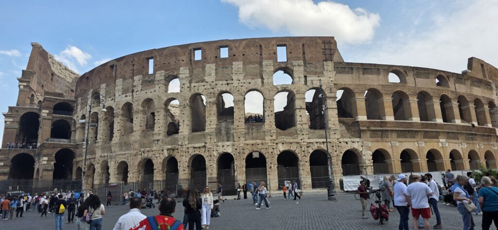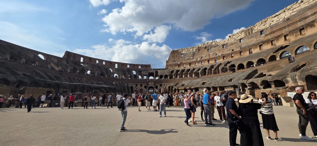 ローマに来たらコロッセオ。アリーナ付きのチケットは1週間前からとのことだが公式は完売なのでツアーで購入。アリーナにも出れるが、なしでもよかった。予定時間の15分前から入場。2階に上がる前にアリーナに出れるが、最後にもアリーナと同じ階で地下を眺めることもできる。2階に上がればぐるっと1周、全方向から写真をとりたくなる。外側には土産も売っており、コロッセオの置物やマグネットを買ってしまう。近くに自販機もあるが、せめて空のペットボトルを持って外で水を汲まないと脱水になる。