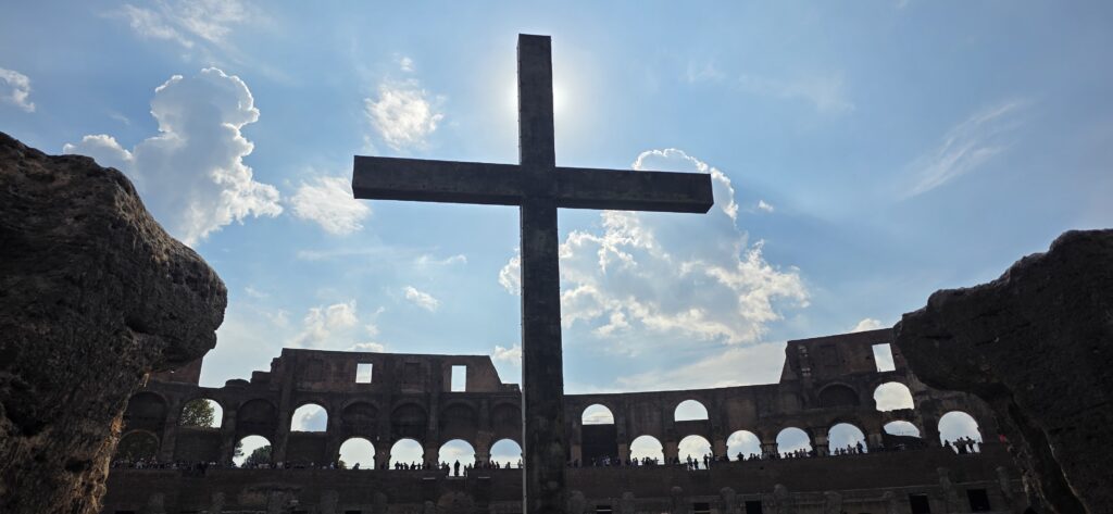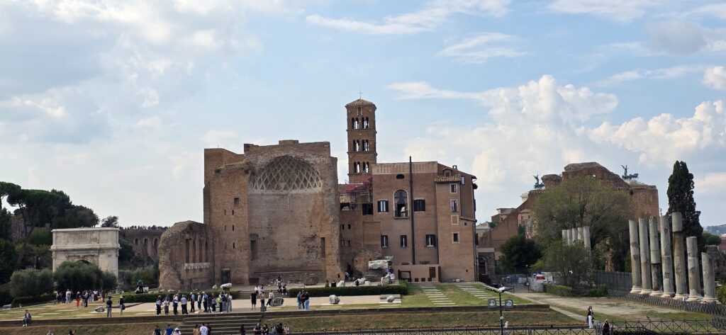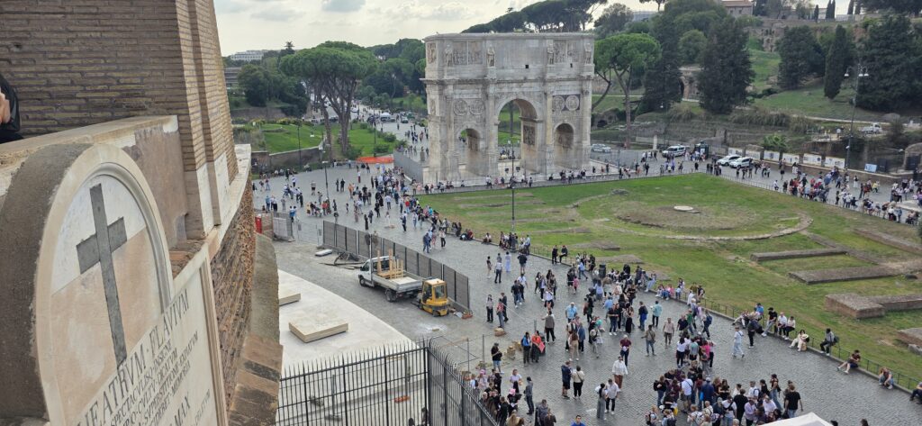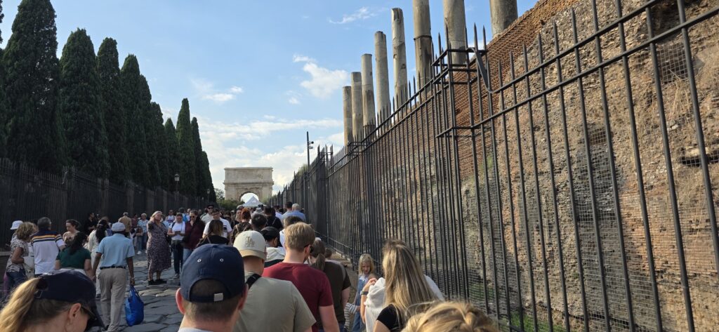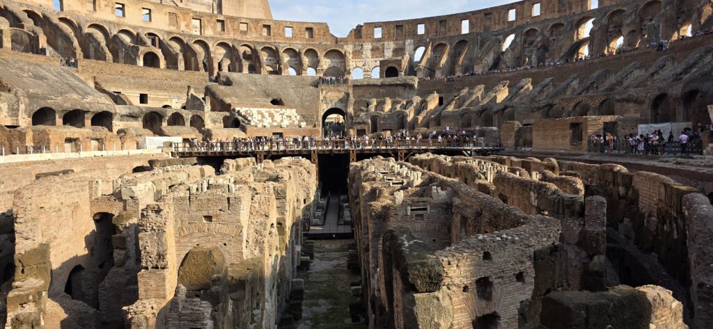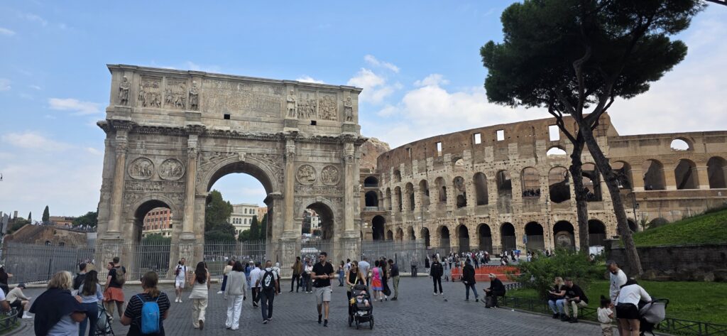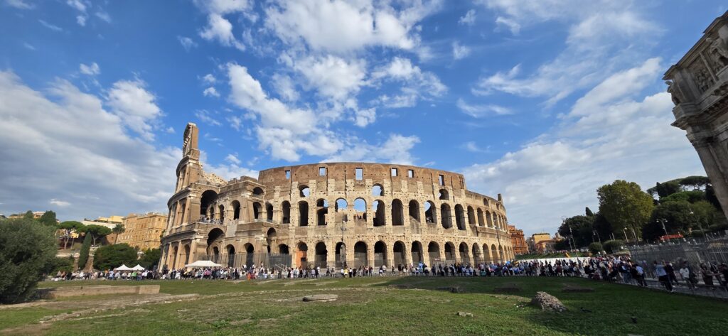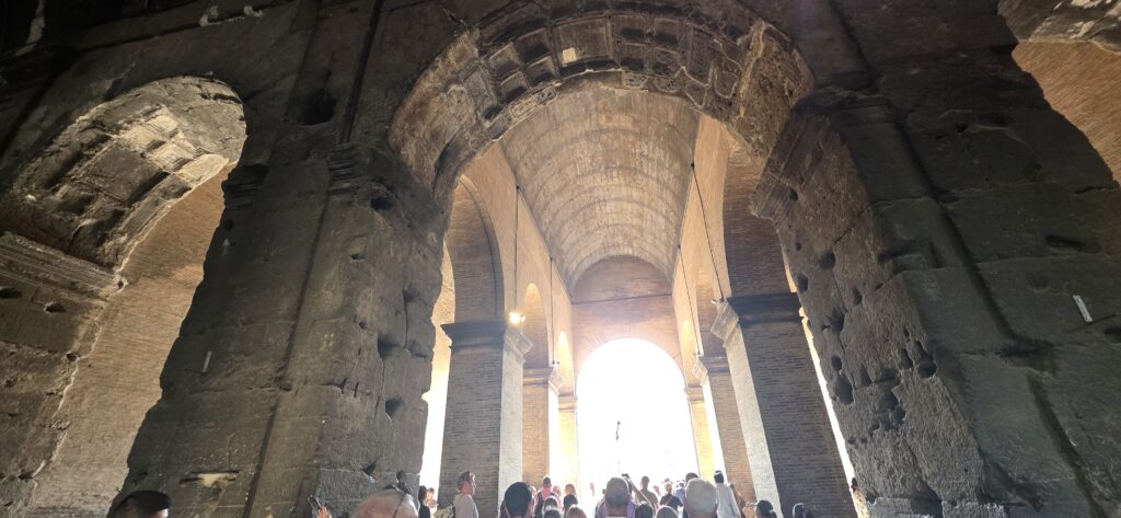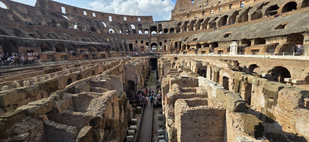 ローマに来たらコロッセオ。アリーナ付きのチケットは1週間前からとのことだが公式は完売なのでツアーで購入。アリーナにも出れるが、なしでもよかった。予定時間の15分前から入場。2階に上がる前にアリーナに出れるが、最後にもアリーナと同じ階で地下を眺めることもできる。2階に上がればぐるっと1周、全方向から写真をとりたくなる。外側には土産も売っており、コロッセオの置物やマグネットを買ってしまう。近くに自販機もあるが、せめて空のペットボトルを持って外で水を汲まないと脱水になる。