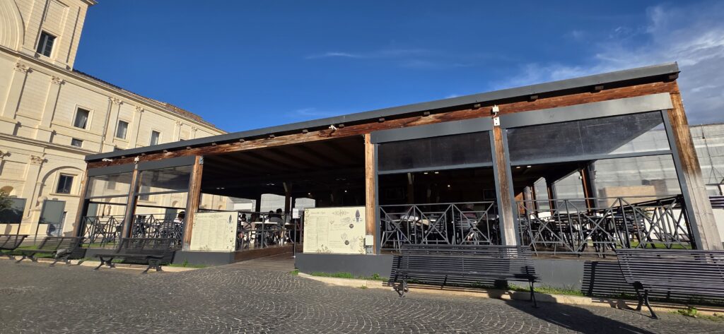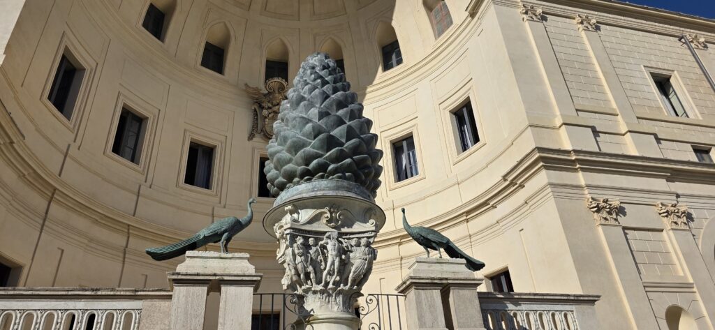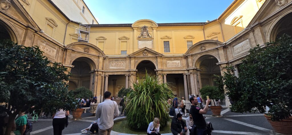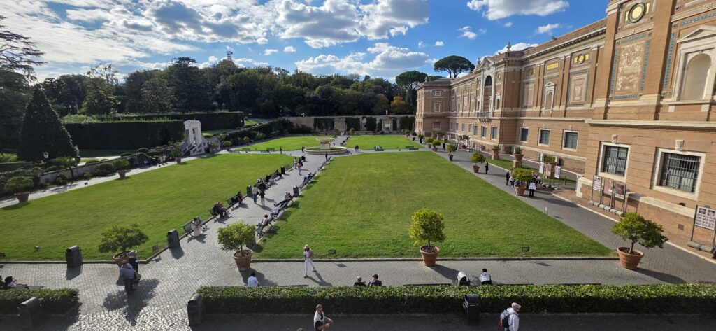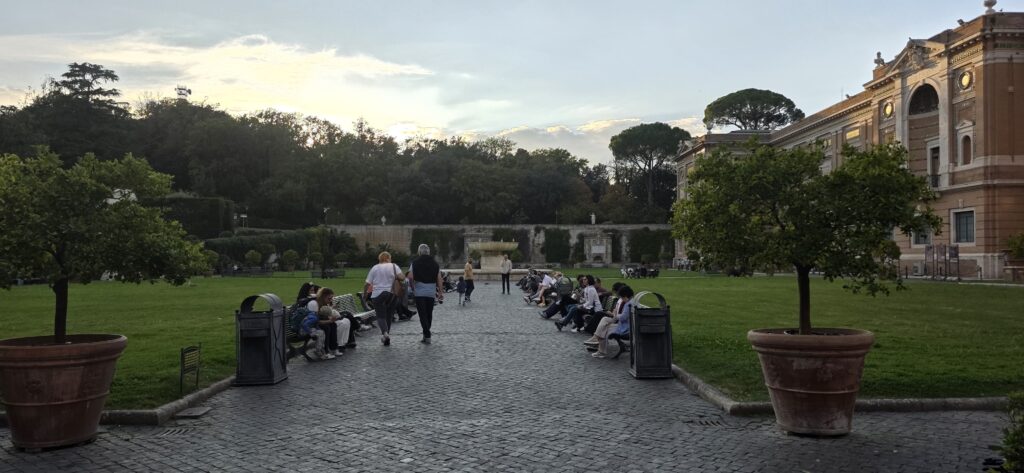ピナコテカを出てから眺めた中庭。ピーニャの中庭など、美術館を散策するうちに遭遇する中庭はいくつかあるが、システィーナ礼拝堂も全部回ってから出た場所。疲れた身体を休めるベンチ。