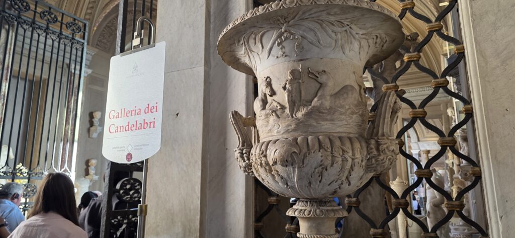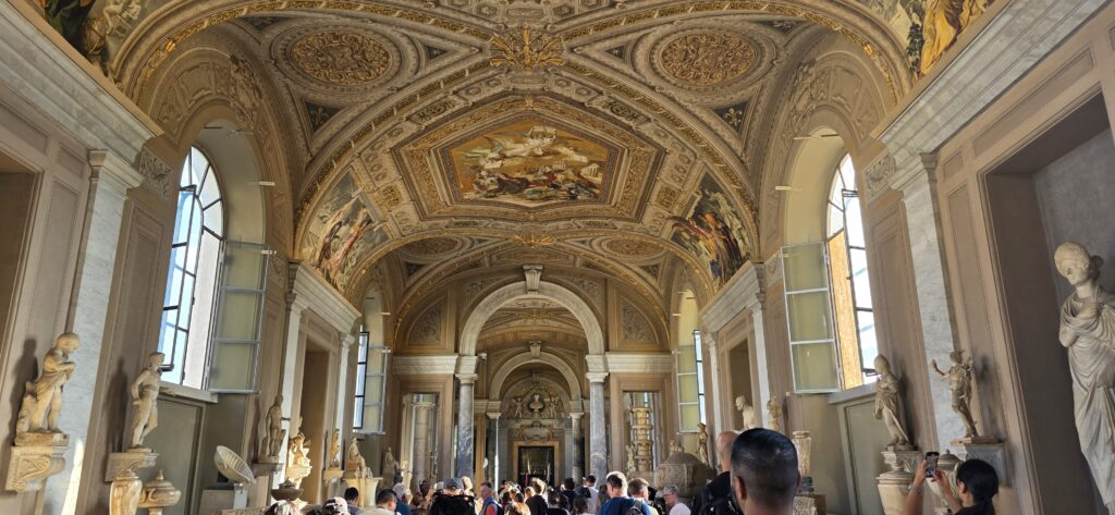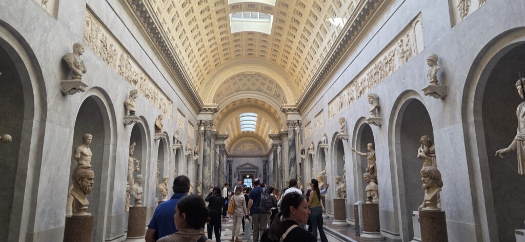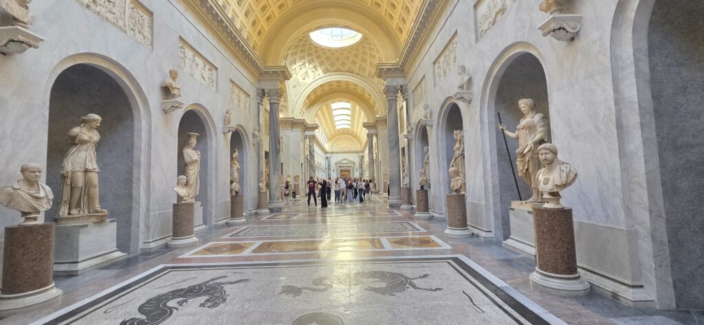 回廊の両脇に古代ローマの美術品が並ぶ。キアラモンティからピーニャの中庭を抜けて辿り着く。天井画も見所。