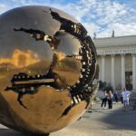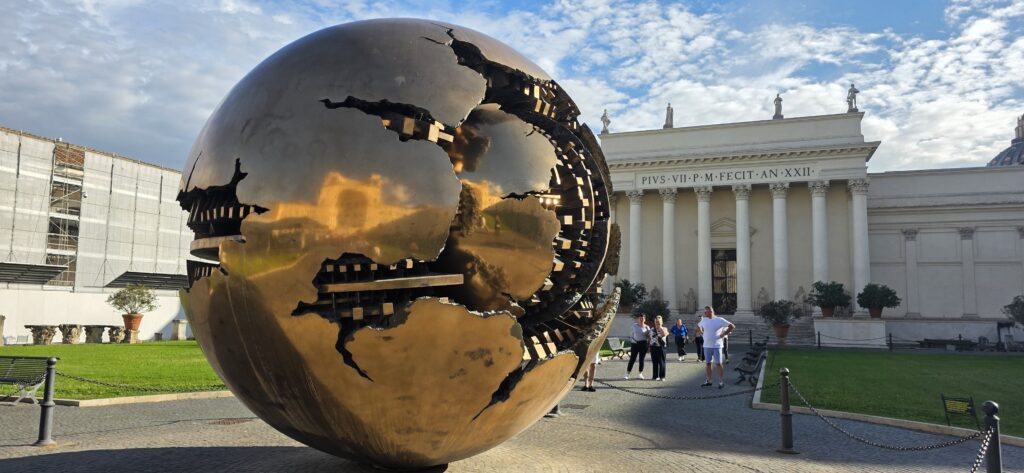 ブロンズ製の松ぼっくりが目印の中庭だが、レストランもあり、さらに中央にある球体は回転していてついつい見てしまう。