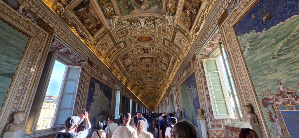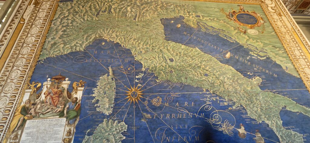 グレゴリウス13世が天文学者に描かせた下絵をもとにした1580年代の地図が並ぶ。色鮮やかな地図が並ぶが、システィーナ礼拝堂までは混んでおりここもゆったり見る余裕はない。あとわかったのは最後の方のイタリアの地図くらい。