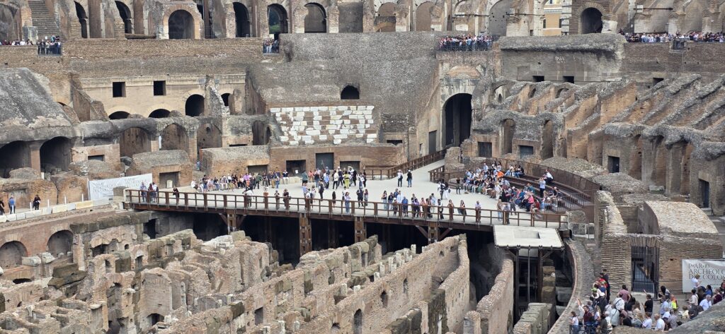 ローマに来たらコロッセオ。アリーナ付きのチケットは1週間前からとのことだが公式は完売なのでツアーで購入。アリーナにも出れるが、なしでもよかった。予定時間の15分前から入場。2階に上がる前にアリーナに出れるが、最後にもアリーナと同じ階で地下を眺めることもできる。2階に上がればぐるっと1周、全方向から写真をとりたくなる。外側には土産も売っており、コロッセオの置物やマグネットを買ってしまう。近くに自販機もあるが、せめて空のペットボトルを持って外で水を汲まないと脱水になる。