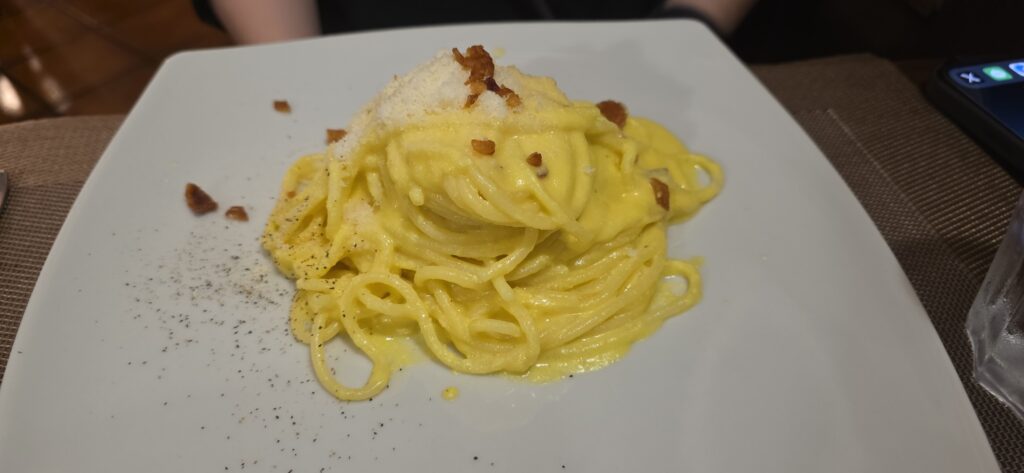 カルボナーラはクリームたっぷり、アルデンテとはいかないか。あっさりしててちょっと物足りないかな。