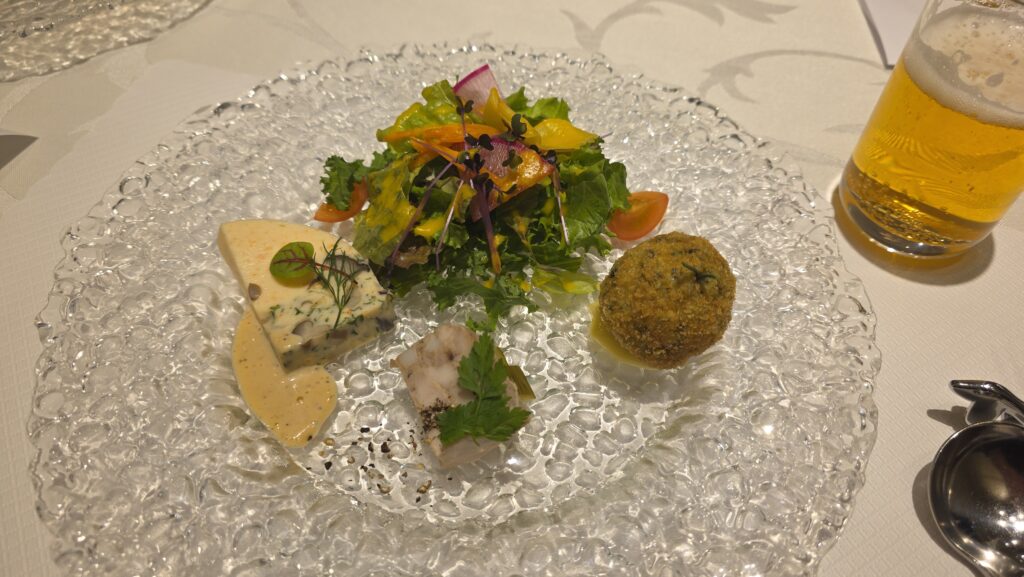 <前菜>海老ときのこのテリーヌ、あきたこまちとギバサのアランチーニ、比内地鶏のパテ、季節のサラダ添え