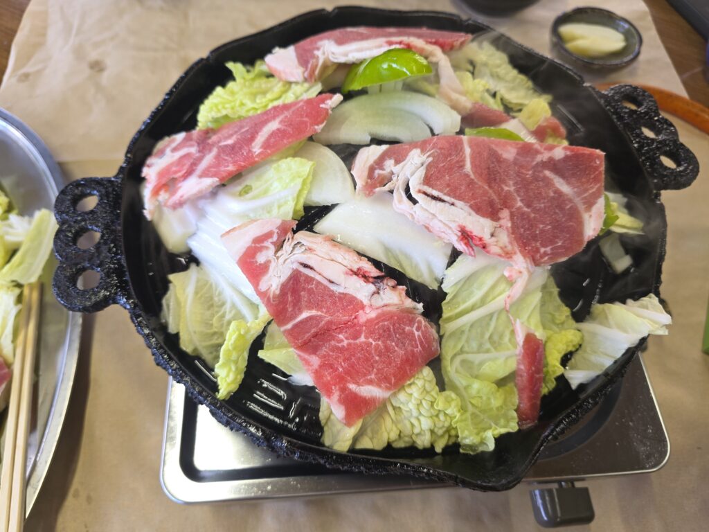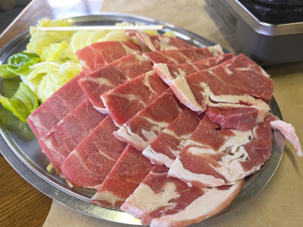 2人前頼んだ。凍った肉がたっぷりと、玉ねぎ、ピーマンと白菜。そして漬けダレがたっぷり。