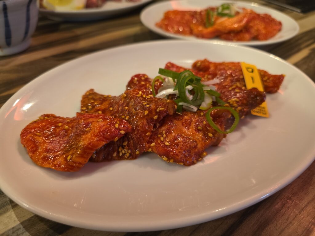 肉の旨味があって少し赤っぽくタレ漬けされた肉。肉本来の旨味よりはタレが少し強いか。入り口のタッチパネルにて、4組待ちなのですぐかと思ったがやはり40分は待った。冷麺は酸味のあるスープで別辛、旨味はそれほどでもない。リーズナブルなカルビ、タン、ロースを焼き肉。タンは塩で厚め、食べごたえがある。タッチパネルで子供と入力したのにカウンターに通された。焼かせるのは初めてだったので生焼けが心配なのでテーブルがよかったな。
