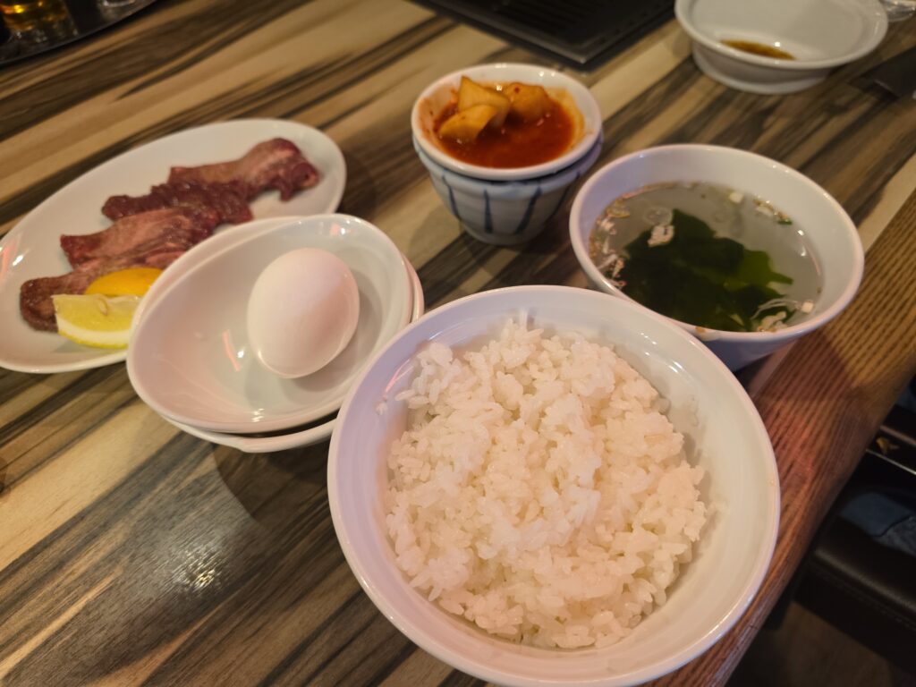 カルビ定食などにすれば米、スープ、なぜか卵もついてきます。