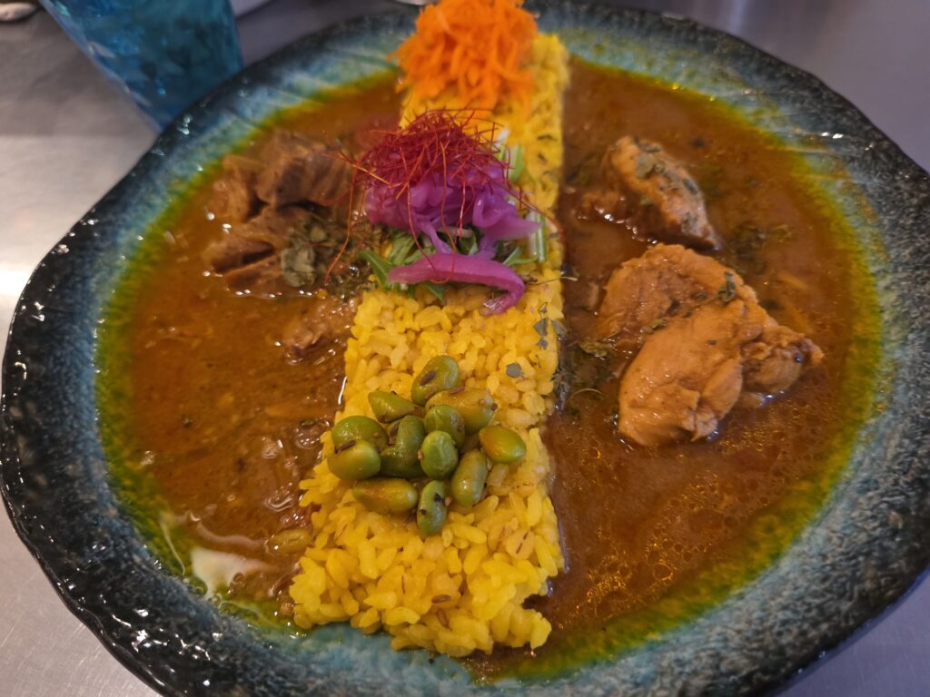 2種のあいがけカレーらしく、サフランライスが堤防になっています。アチャールというか、豆なんか3種類がライスの上に乗っているので崩しながらそれぞれ味わう。