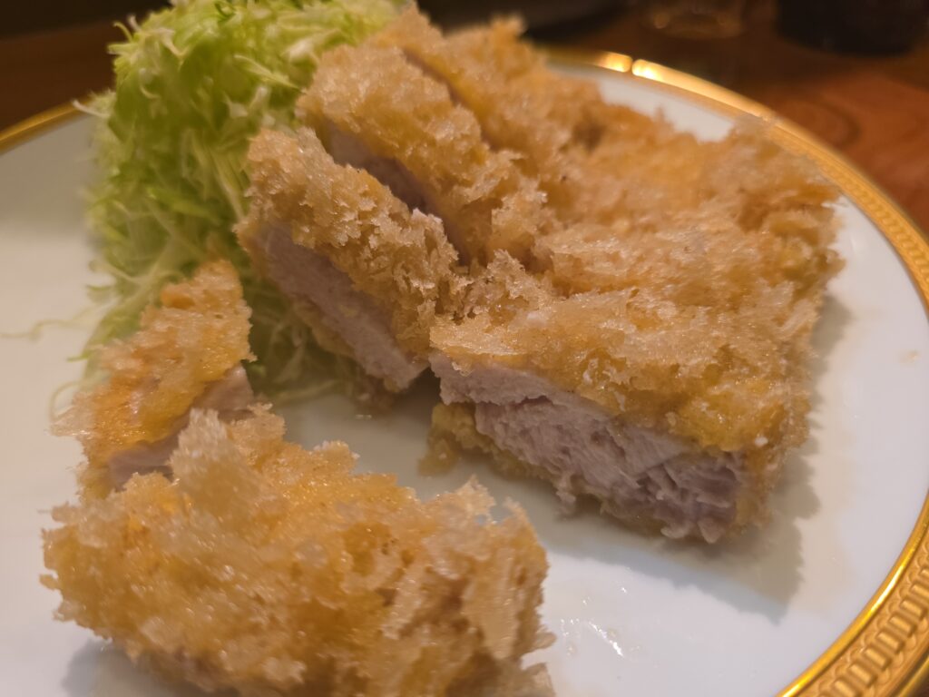 揚げ揚がりのトンカツを見ればもうそりゃあ高級てのはわかる。フワフワで真っ白な衣、肉からはほどよい脂。