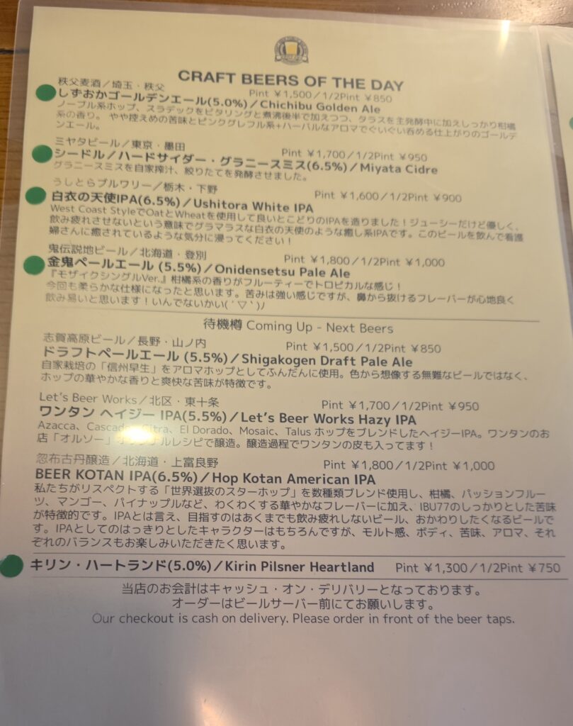 国内ビールが4tapとハートランドもある。ミヤタビールのシードルもあるし、うしとら、金鬼といった有名で好みのビール。やはりうしとら、白衣の天使IPA。