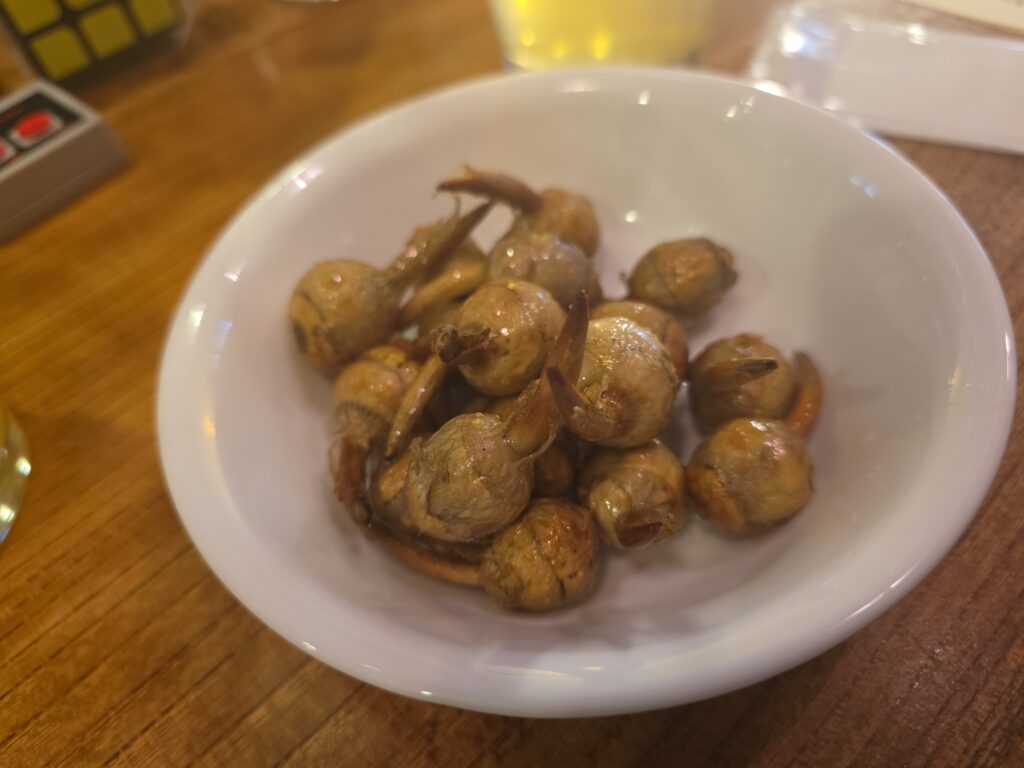意外と料理が旨そうなので軽いつまみを頼む。珍しいくわい、そのままつまんで食べる。