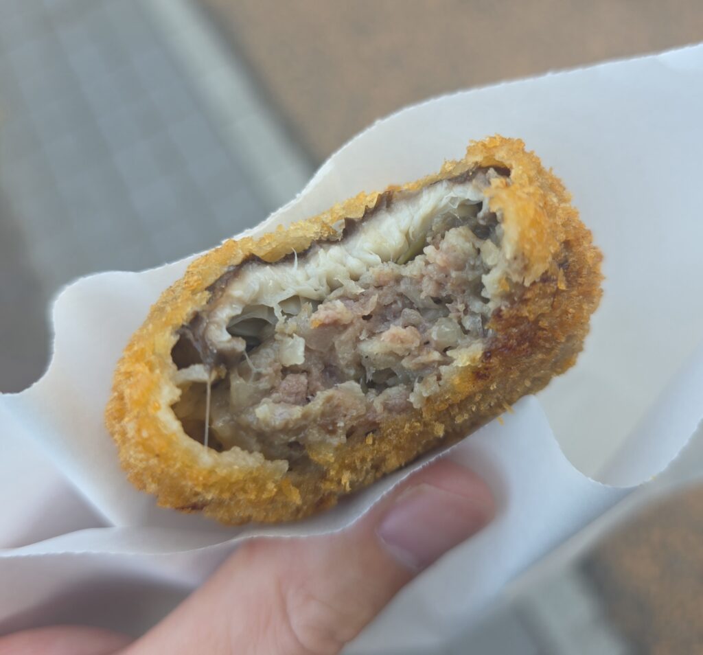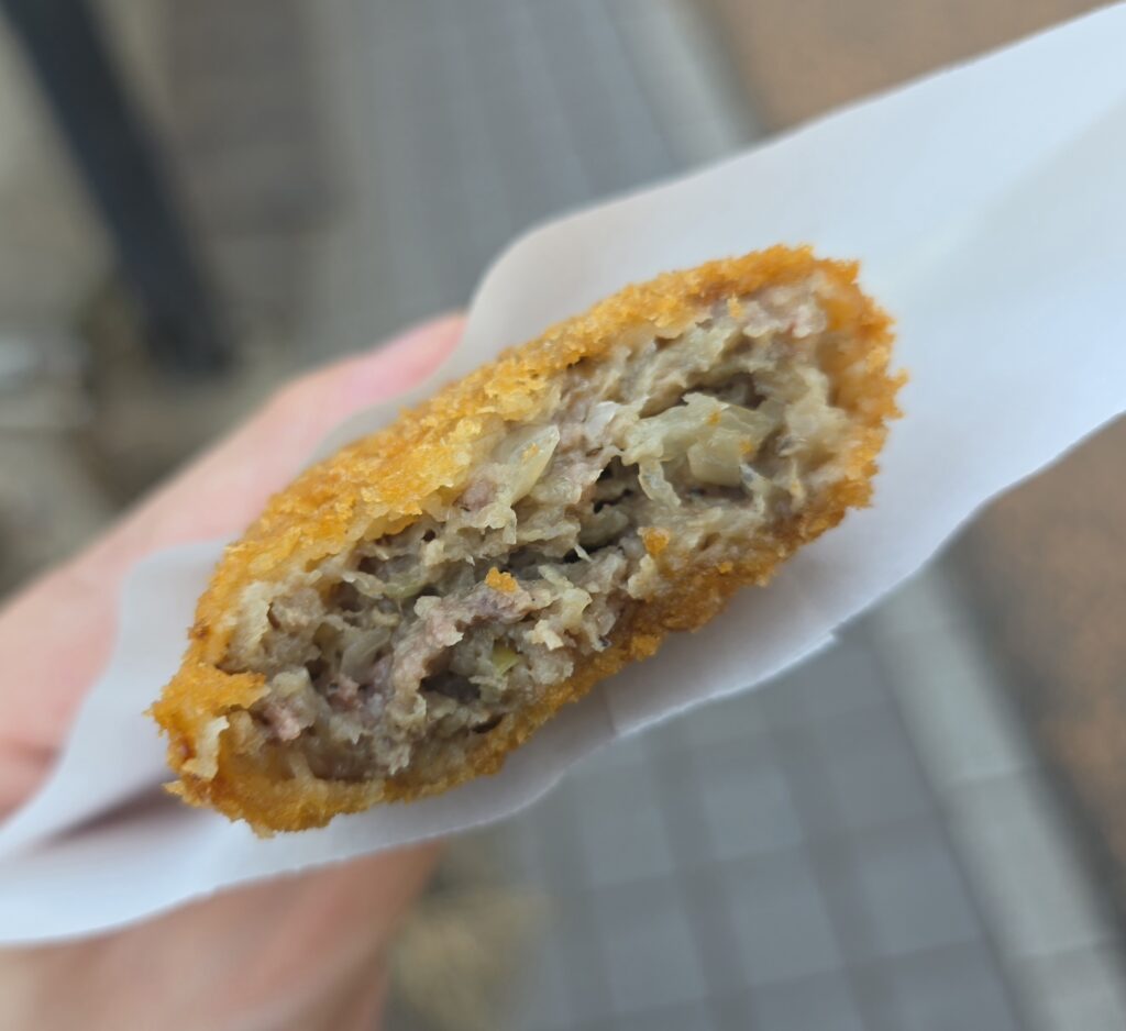それでも具沢山。食べ歩きのメンチって旨いよな。椎茸メンチって、椎茸が刻んで入ってるのかな。そのまま入ってました。旨味たっぷり、椎茸苦手な人はダメかもね。
