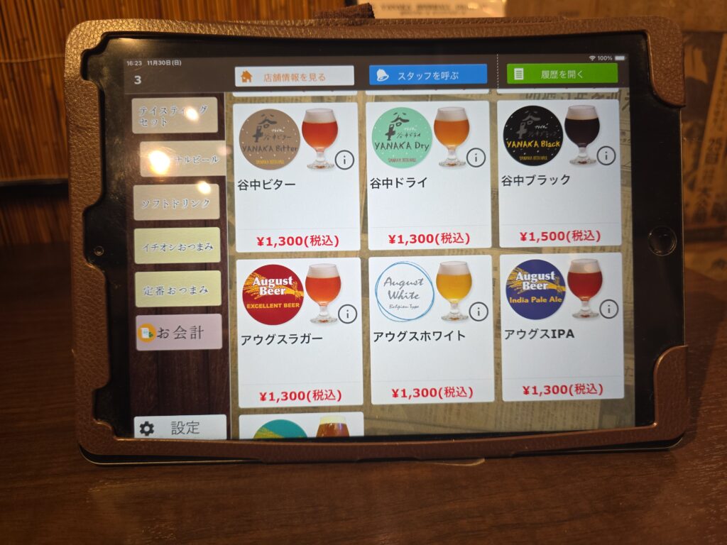 中に入ってタッチパネルで受付すると、7組待ち。QRコードで連絡も来るので谷根千を歩いてみる。コロッケをつまみながら角打ちでビールなんて最高か。