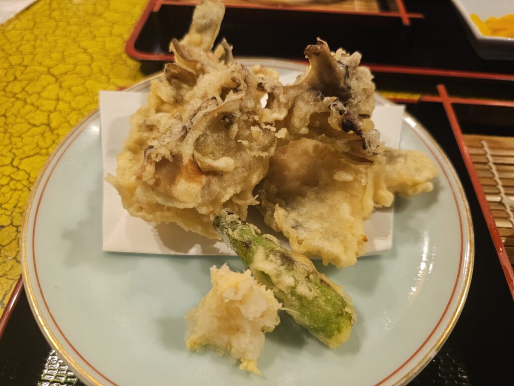 天婦羅用の天つゆもついてきます。はたはた天と、舞茸も大ぶり。