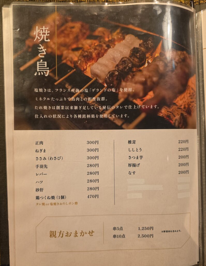 炭焼きっていうくらいだから焼き鳥を頼もう。親方のおまかせがありますが、我々レバー苦手なので単品で。
