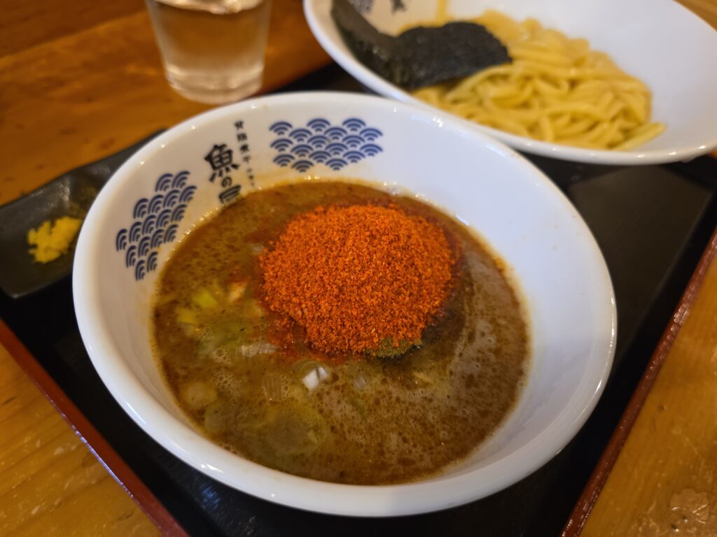 ゴロゴロチャーシュー、メンマ、濃厚な魚粉のスープ。かと思えば味薄めなので卓上の追いタレいれて太麺をつける。結構モチモチしてるので、つけにくいかもしれない。