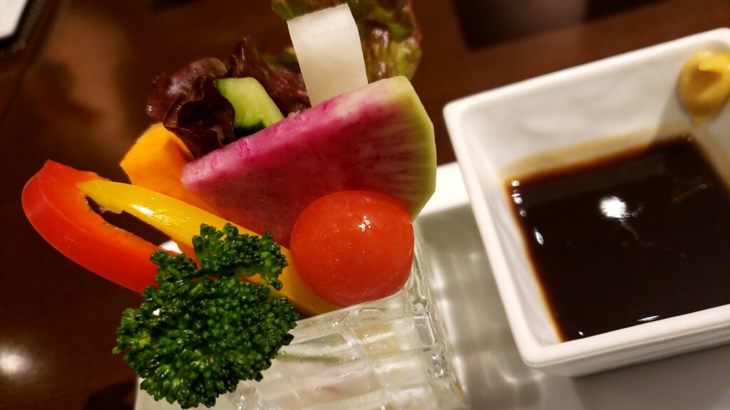 野菜スティックを比内地鶏の肉味噌につけ、鮭のマリネも絶品。