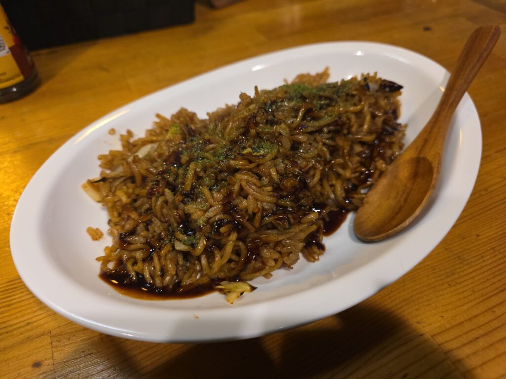 チキンカツと、今日はそばめしを作ってもらった。濃厚なピリ辛ソース。