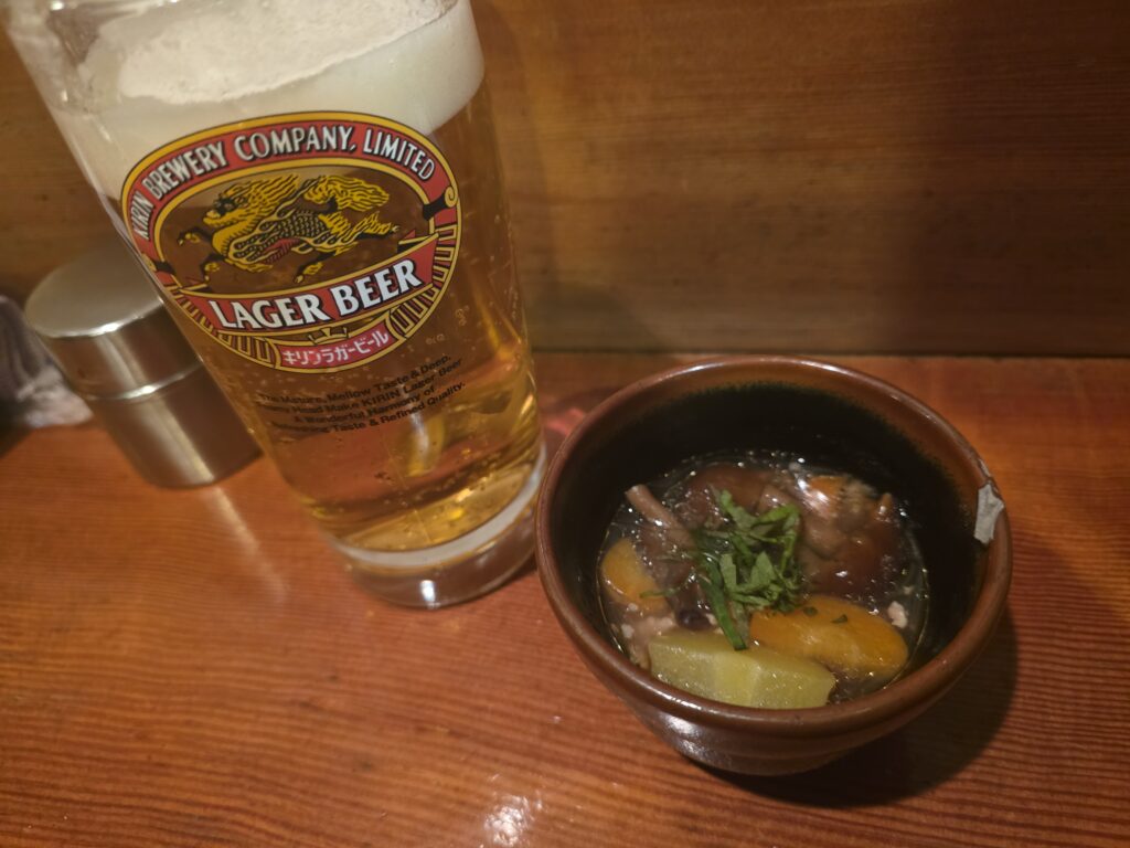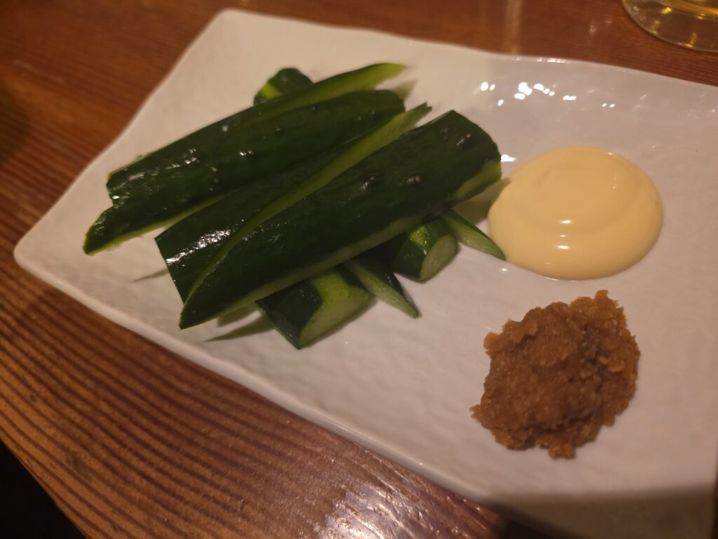 基本おまかせで9本来るというので、とりあえず生ビールを頼んだけど、後ろの席は来るのが遅いらしいので一品料理オススメとのこと。確かに30分以上串は来なかったので、味噌キュウリ、週末限定のサガリを頼んだ。