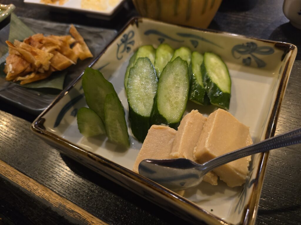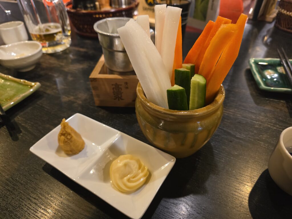 ヘルシーに野菜スティックと、豆腐味噌漬けが日本酒に合う。