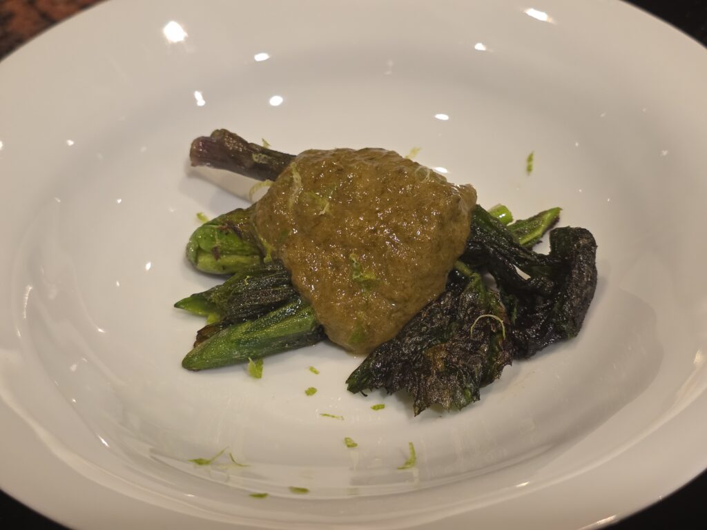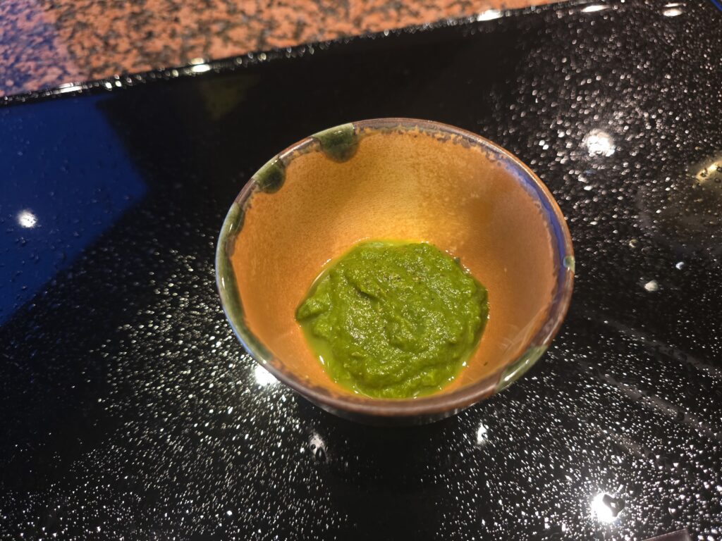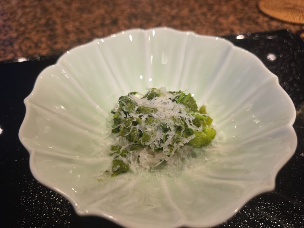 タラの芽、カンゾウと山菜が続きペコリーノチーズ、米でリゾットみたいになっている。