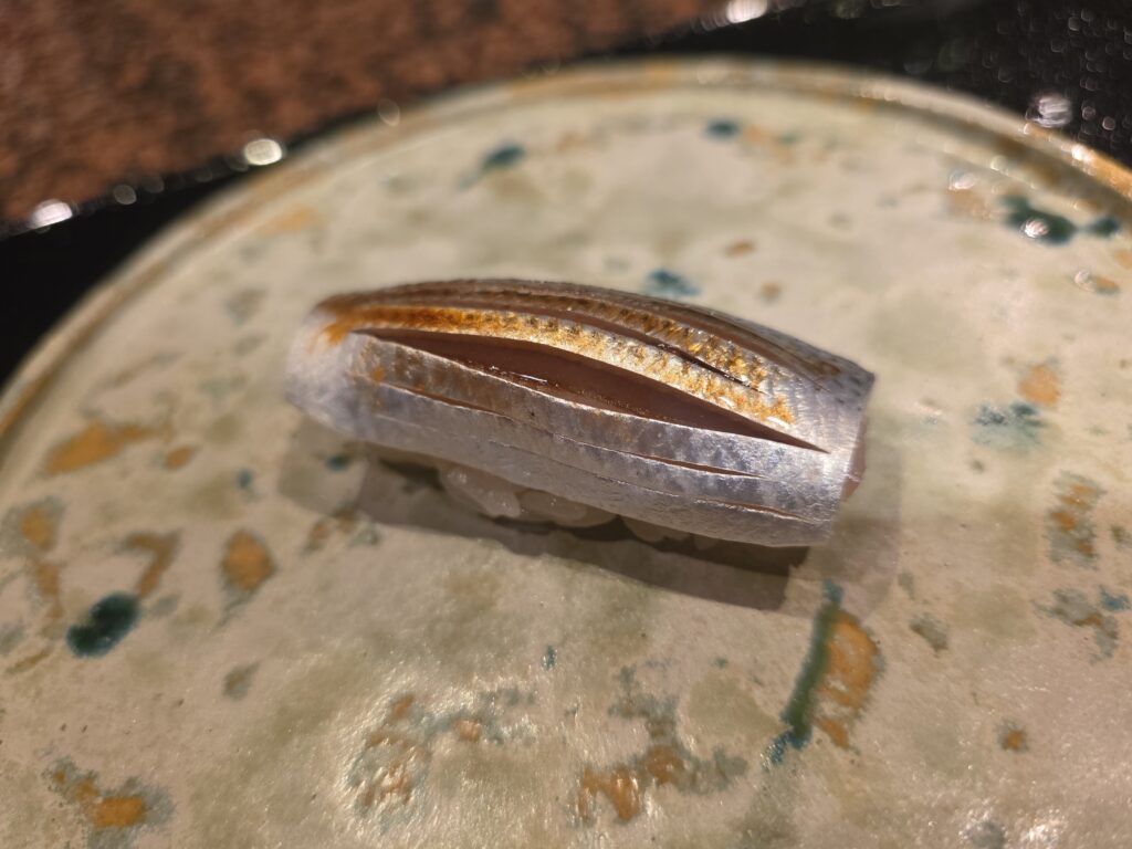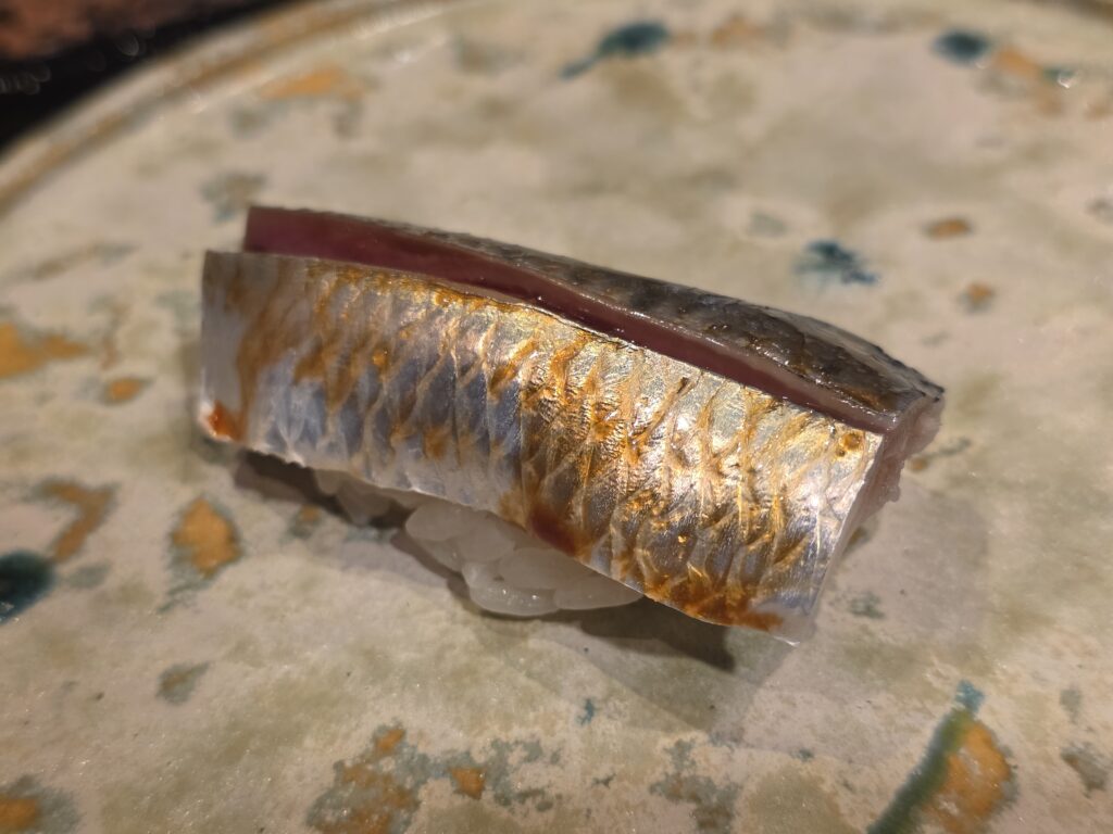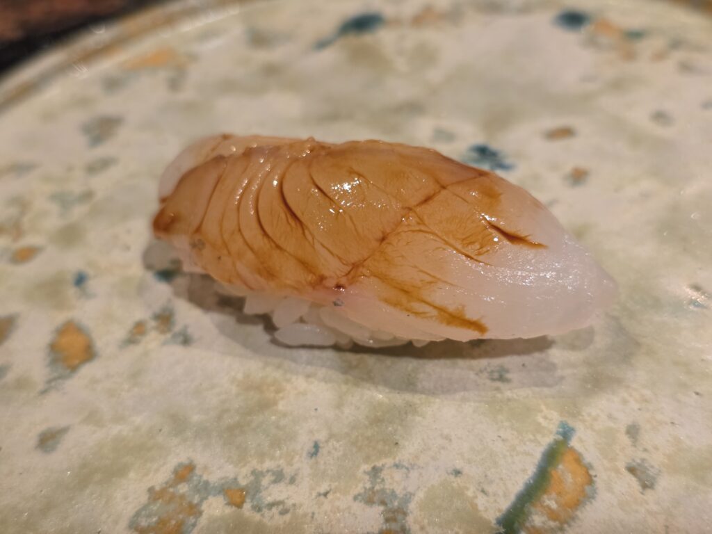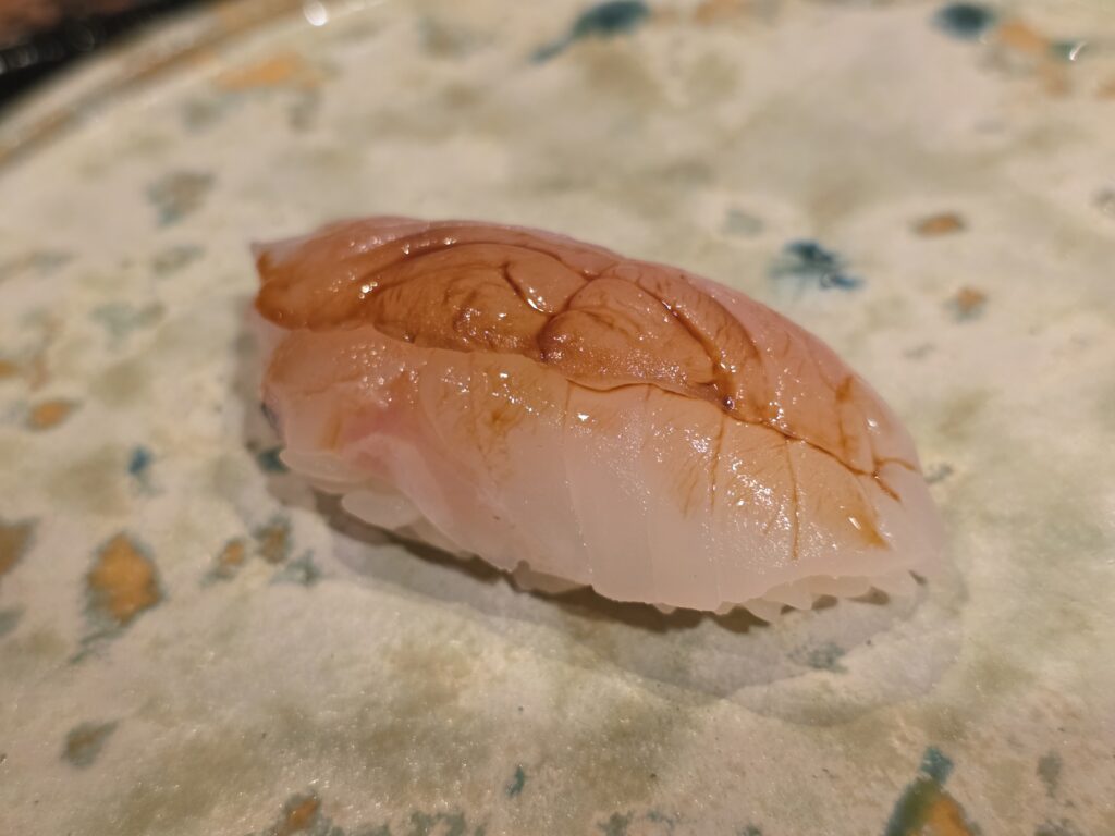 こちらの鮨、白身は2種類のハイブリットてなことで、ヒラメ、ホウボウが一緒になっている。こういう店では手でいただきましょう。シャリは赤酢などはなく、醤油はやや強めだろうか。