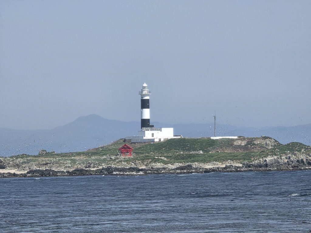向こうに見える灯台、島にはカモメが群がっています。